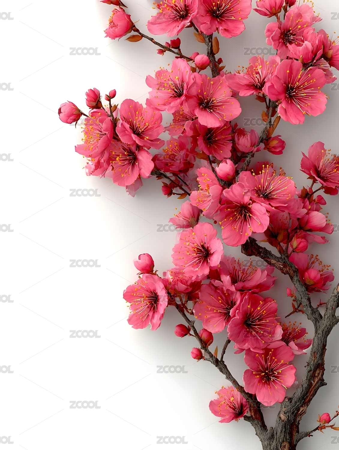 粉色樱花树枝盛开在白色背景前