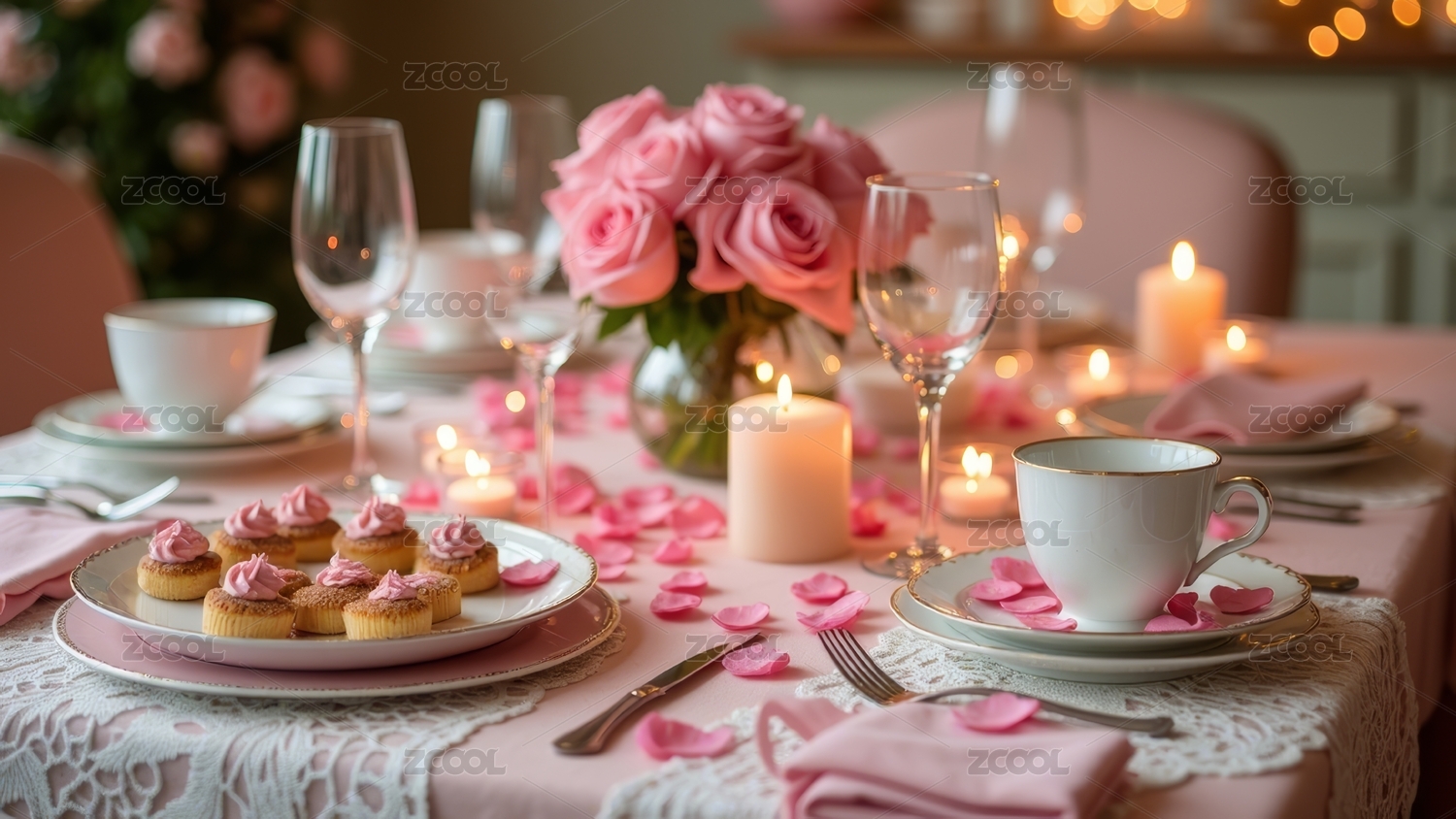 室内浪漫餐桌的玫瑰烛光布置