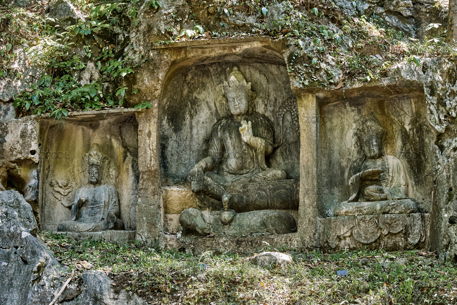 浙江杭州飞来峰岩壁上的石刻佛像群