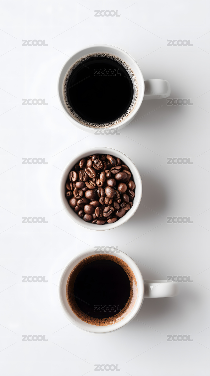 咖啡豆、浓咖啡、淡咖啡分层摆放