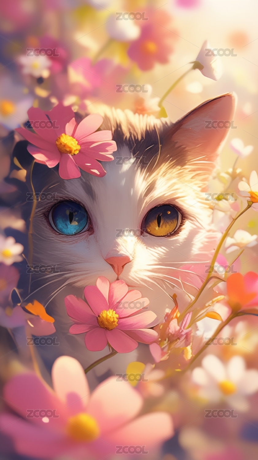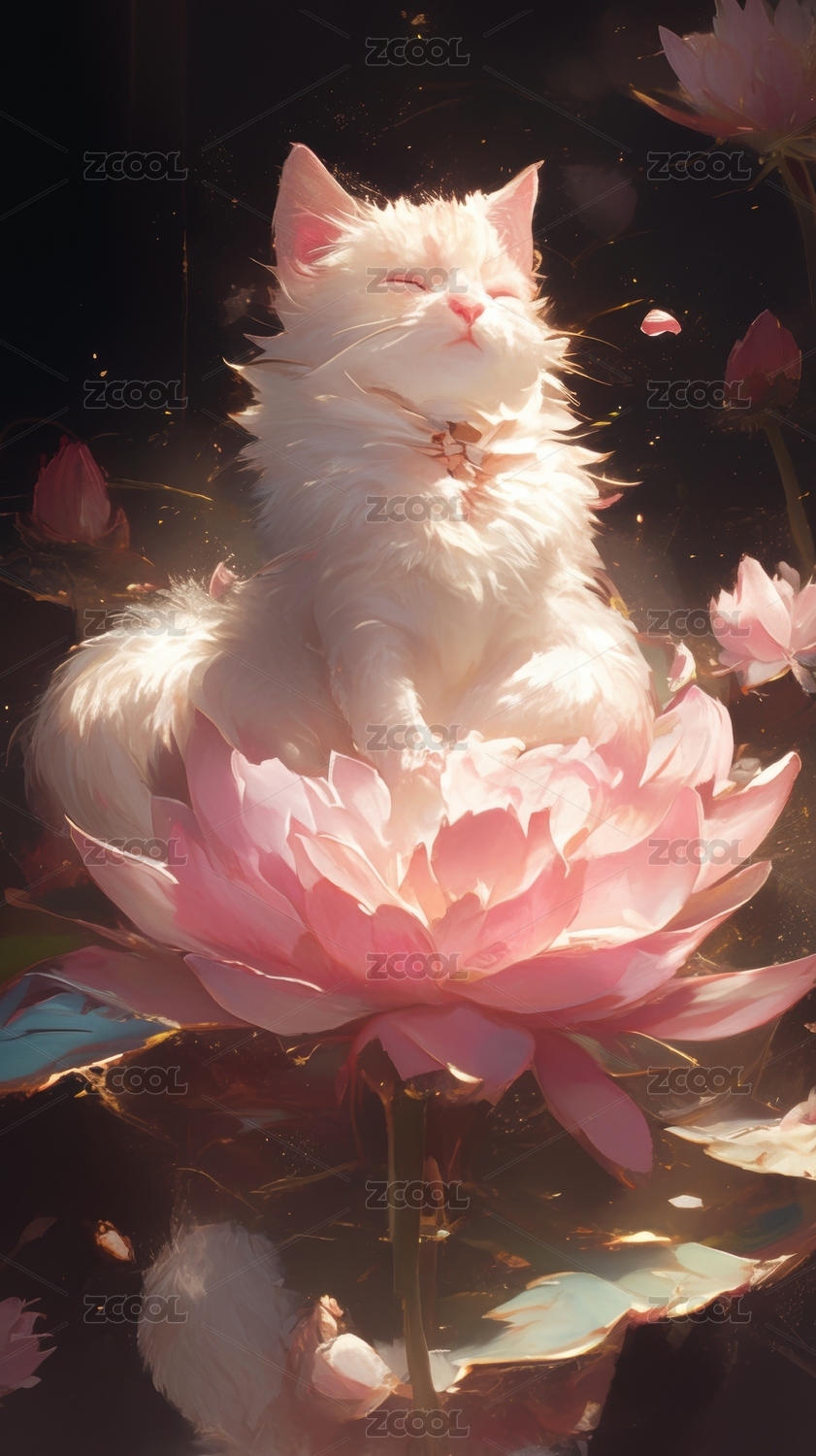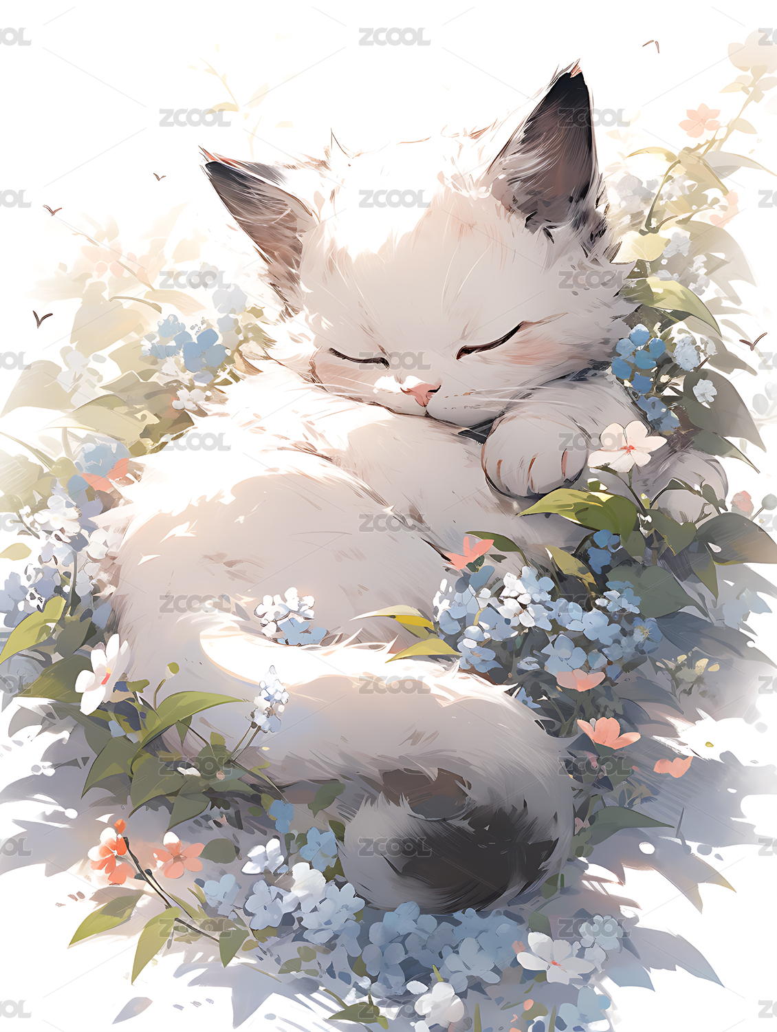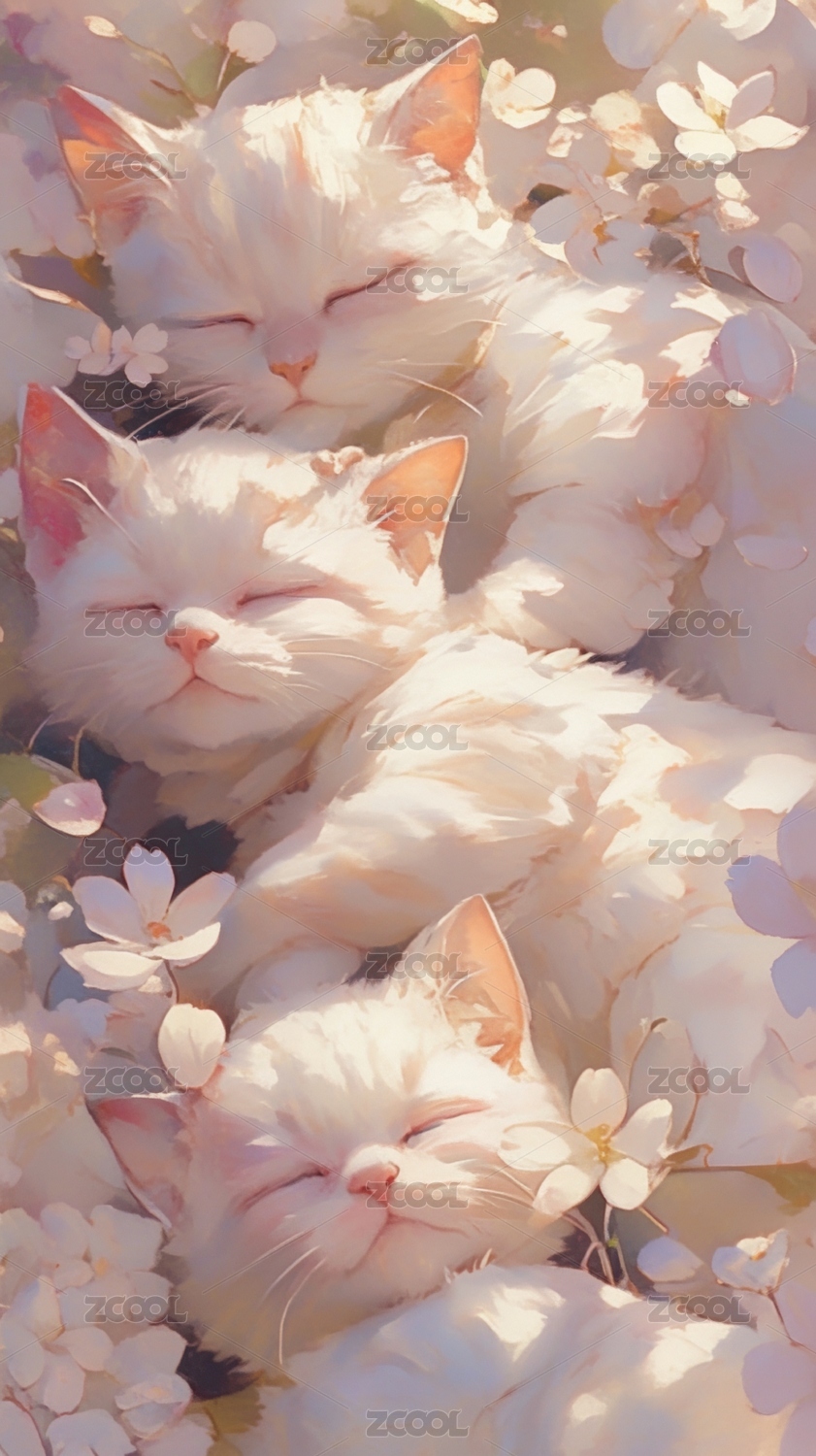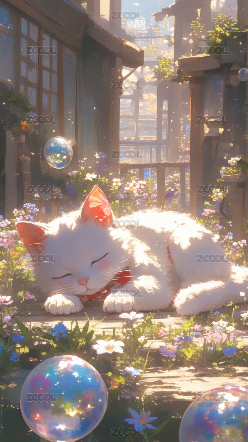 梦幻唯美猫咪和女孩在草坪上睡觉的手机插画