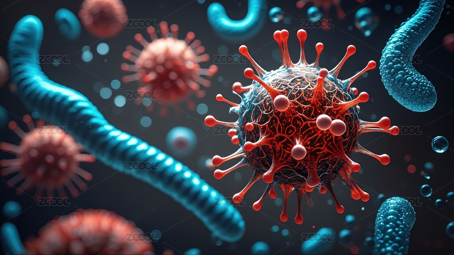 蓝色病毒与红色血细胞在画面中呈现