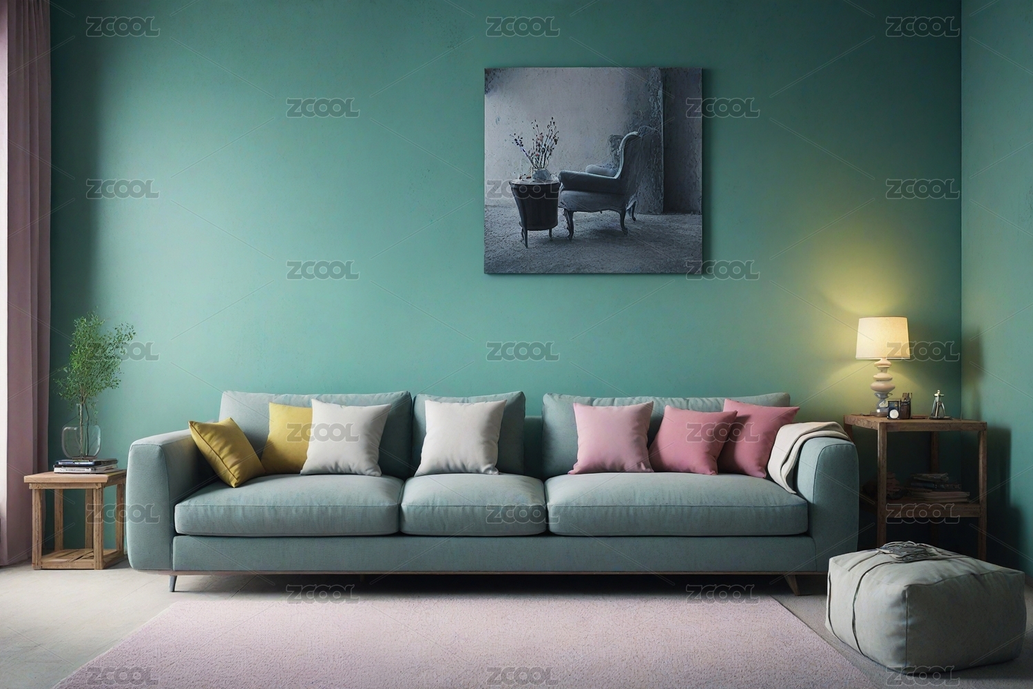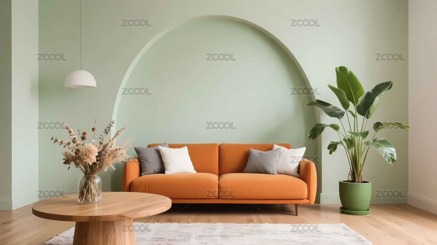 客厅,沙发,绿色墙壁,木质地板,咖啡桌,橙色靠垫,绿色沙发,现代设计,自然光,室内植物