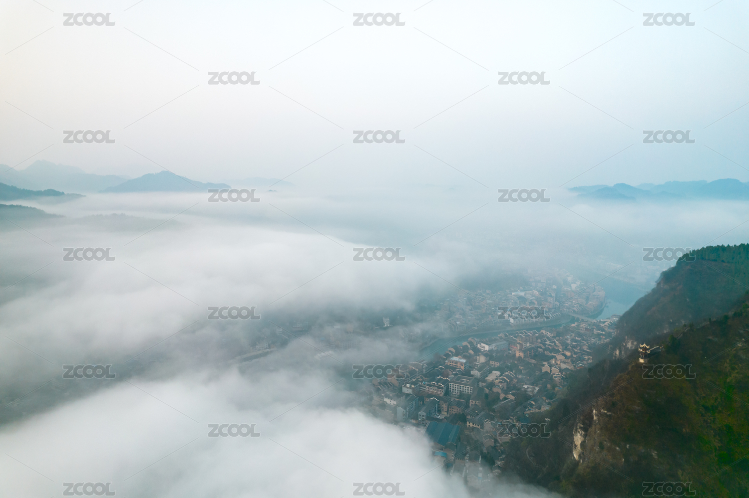 中国贵州省黔东南镇远古镇云海风光航拍