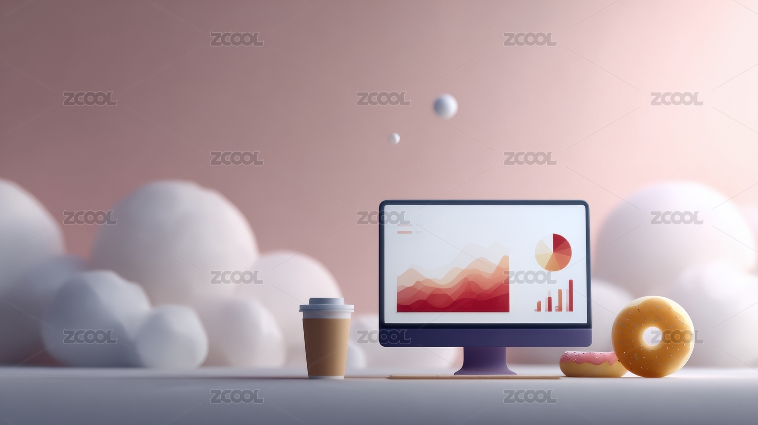 电脑,卡通,极简,创意,办公,桌面,咖啡,盆栽,现代,数据
