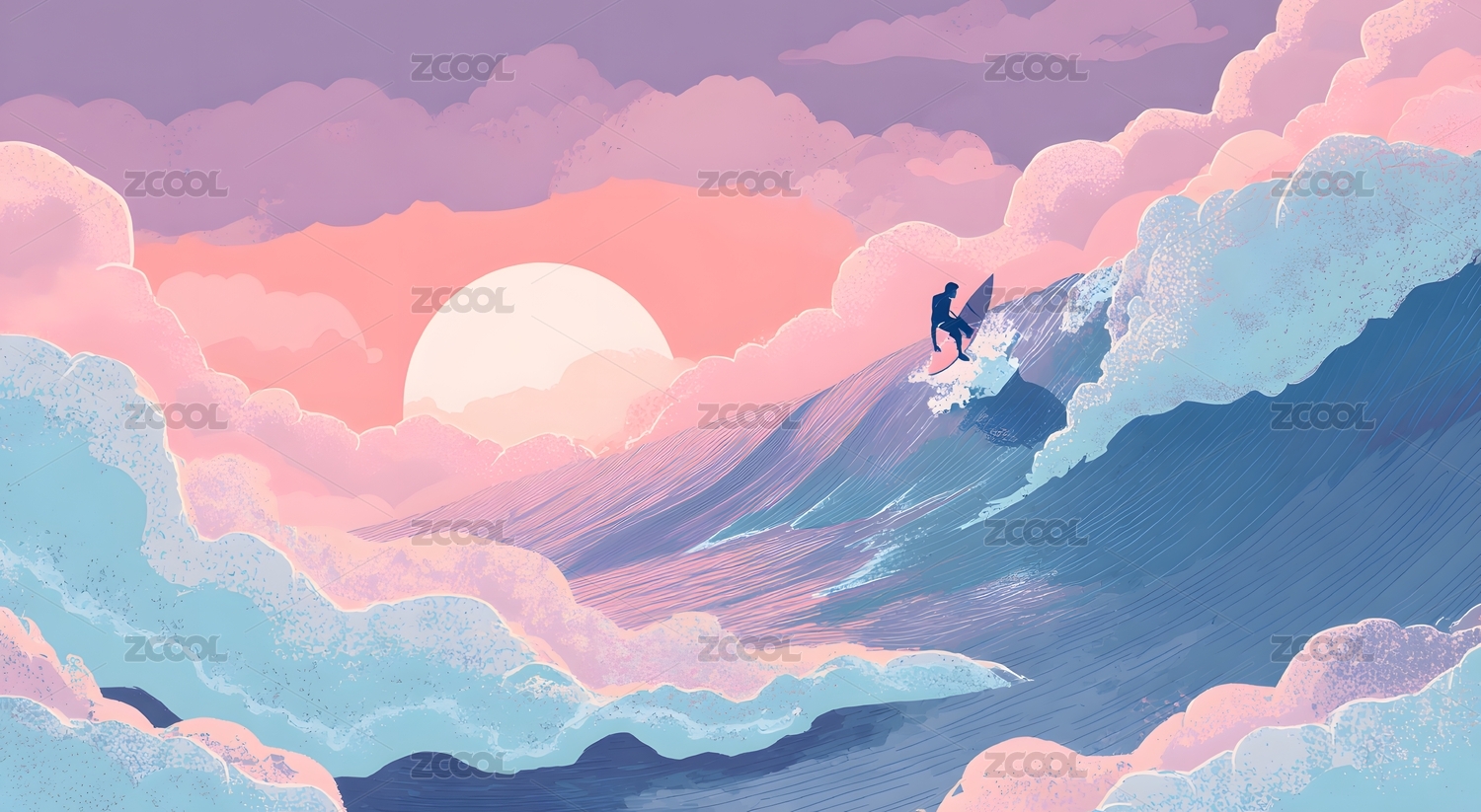 蓝天中畅游的蓝鲸唯美治愈超现实淡彩插画