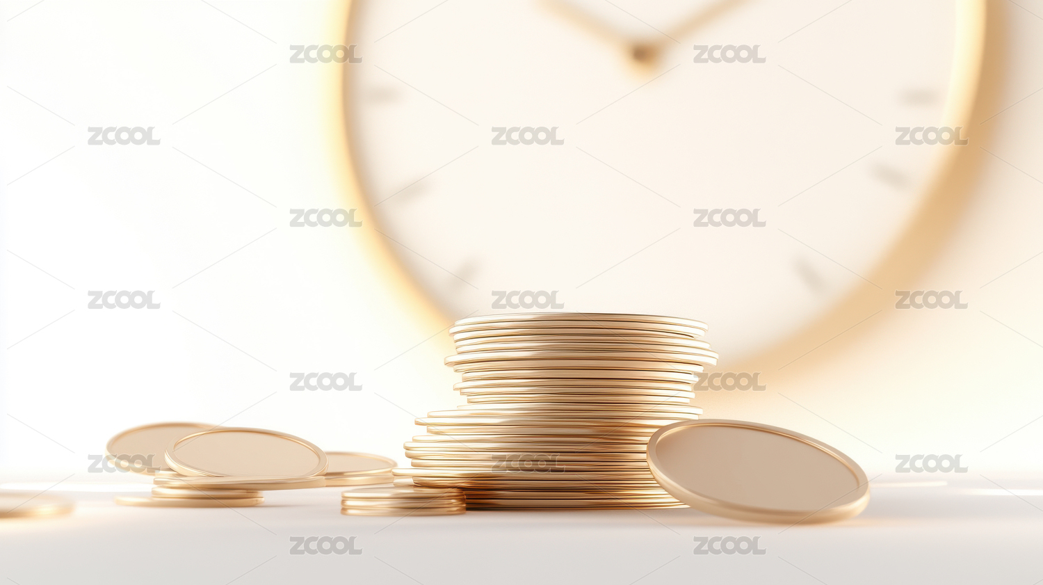 时钟旁堆叠的金色硬币