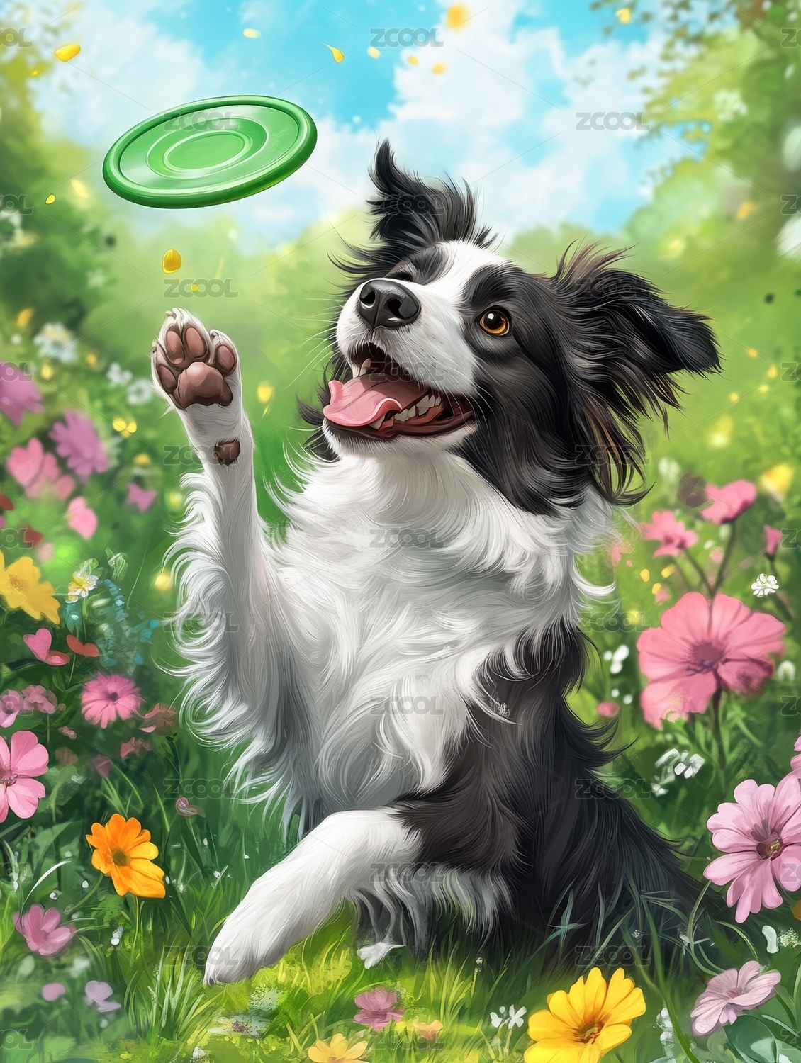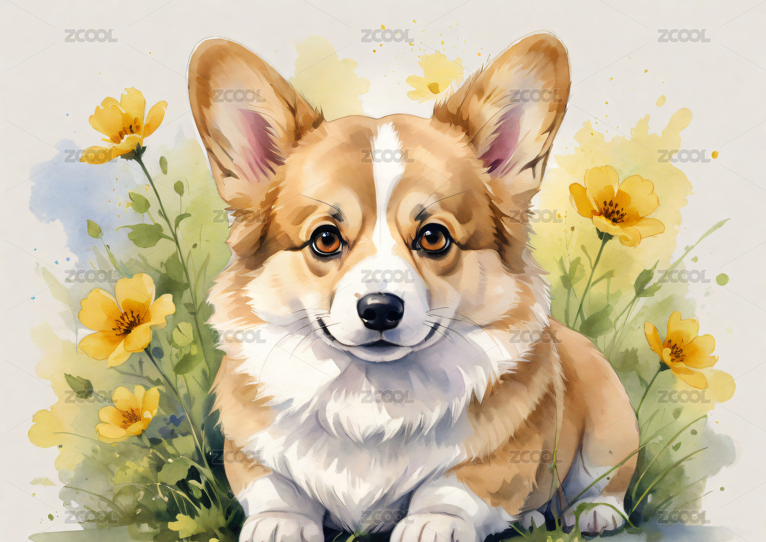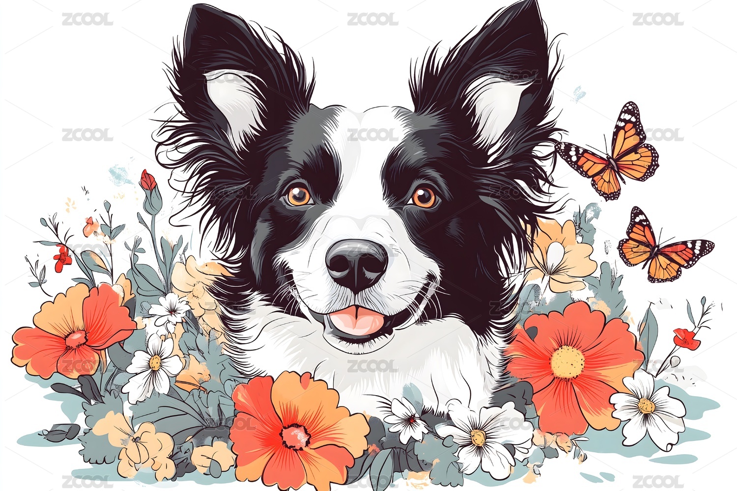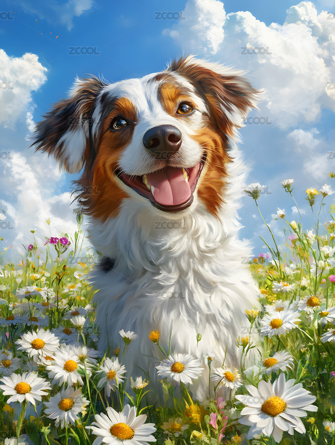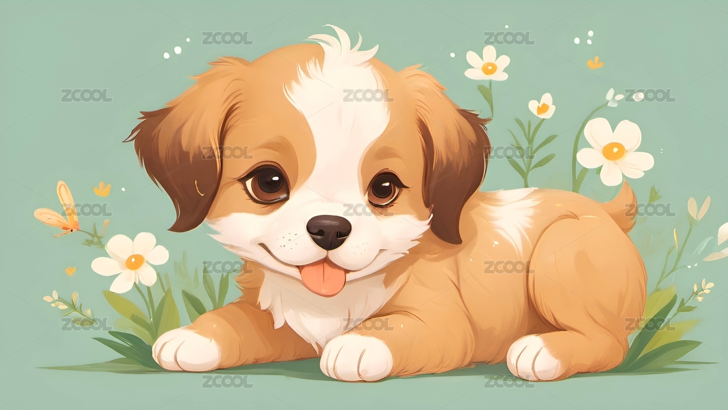 小狗,宠物,可爱,快乐,花朵,春天,阳光,草地,卡通,插画
