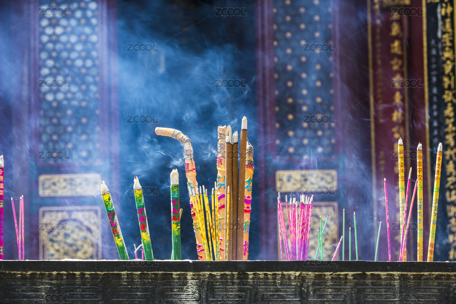 中式传统道观寺庙门前香炉中点燃的香,烟雾