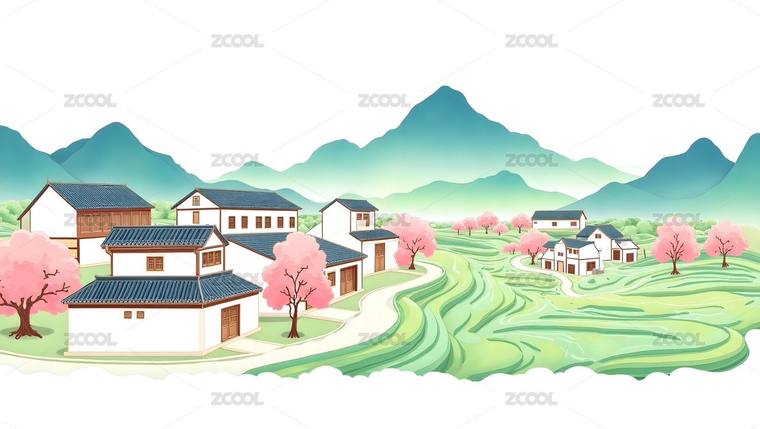 房屋,树木,桃花,道路,乡村,白墙,村落,风景,插画,春天