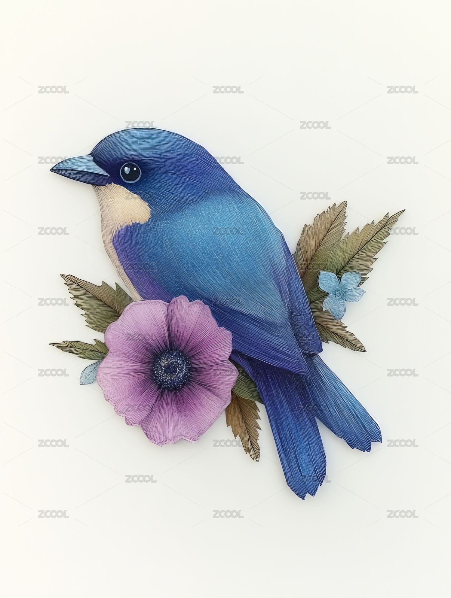 一只小鸟站在树枝上衔着花枝 水彩手绘插画