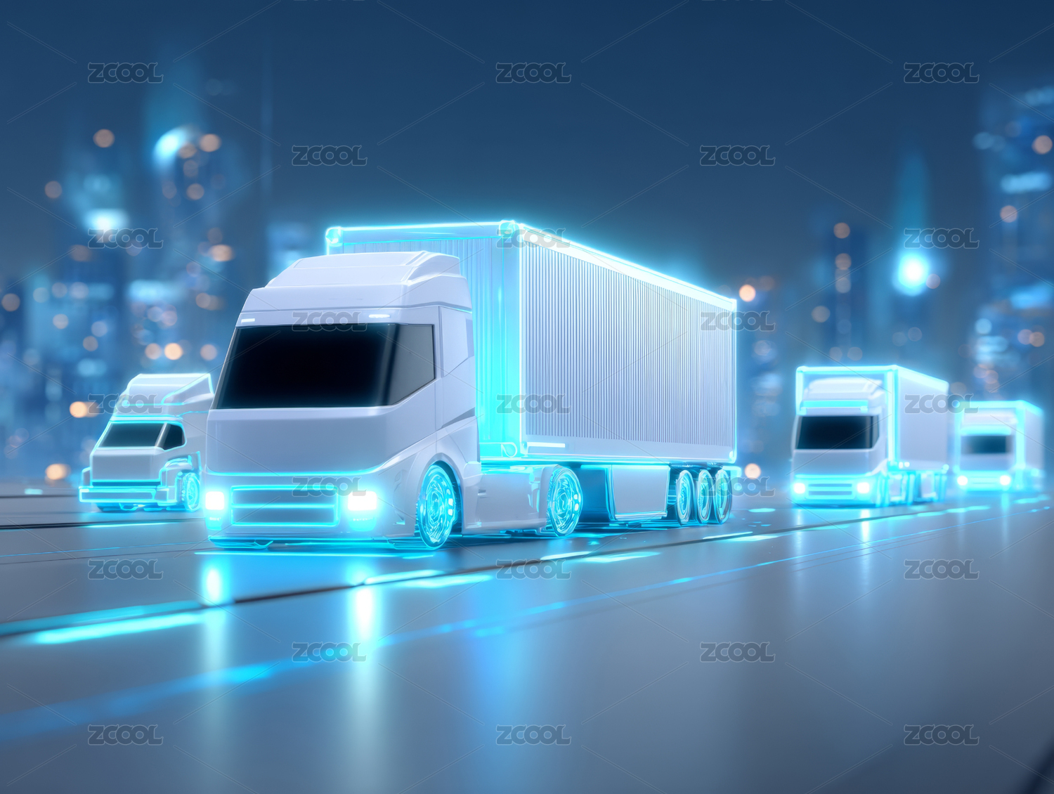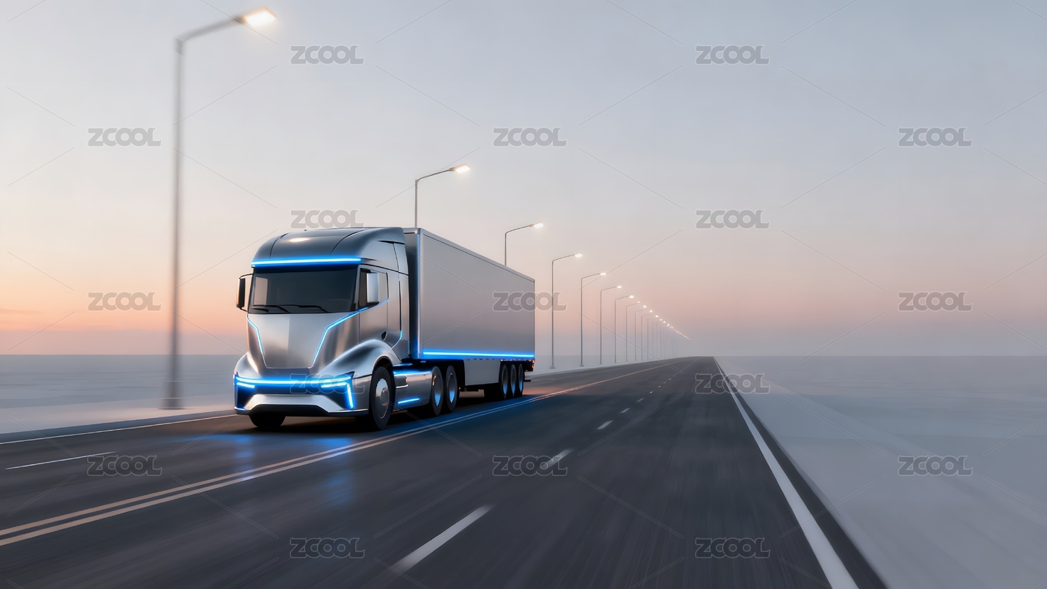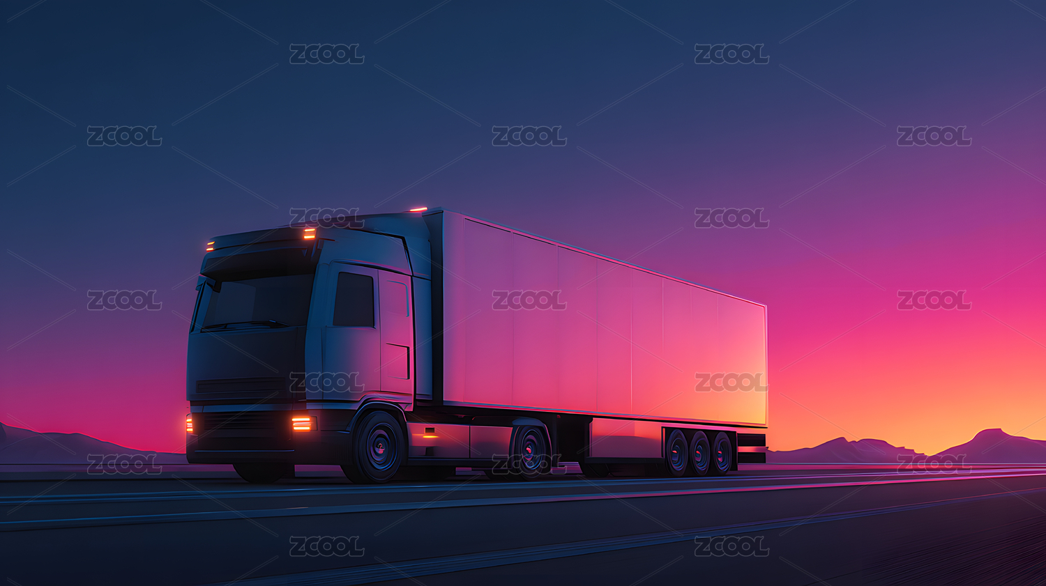 日落时分智慧公路上奔驰的自动驾驶卡车车队