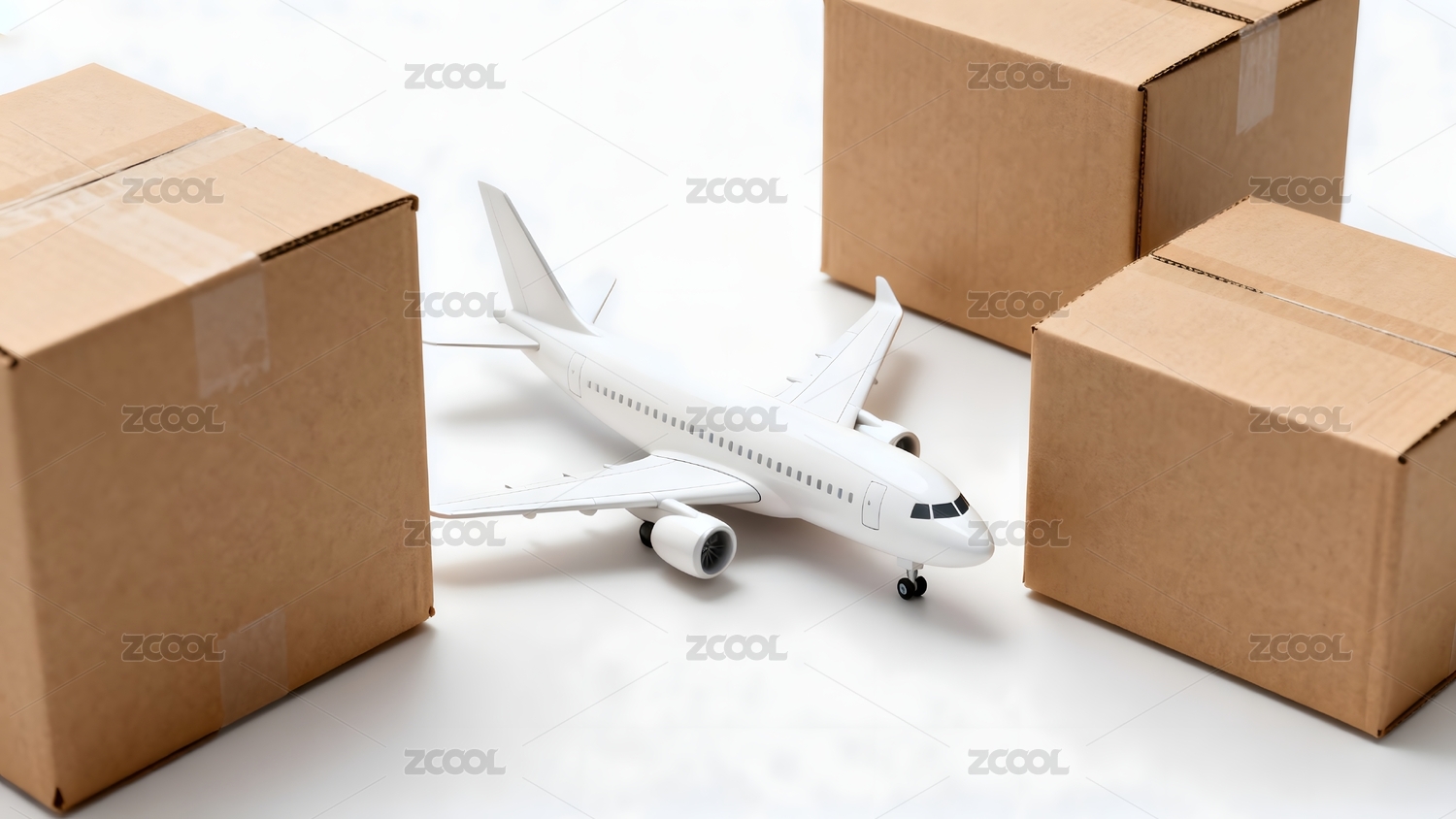 白色飞机模型与纸箱环绕展示
