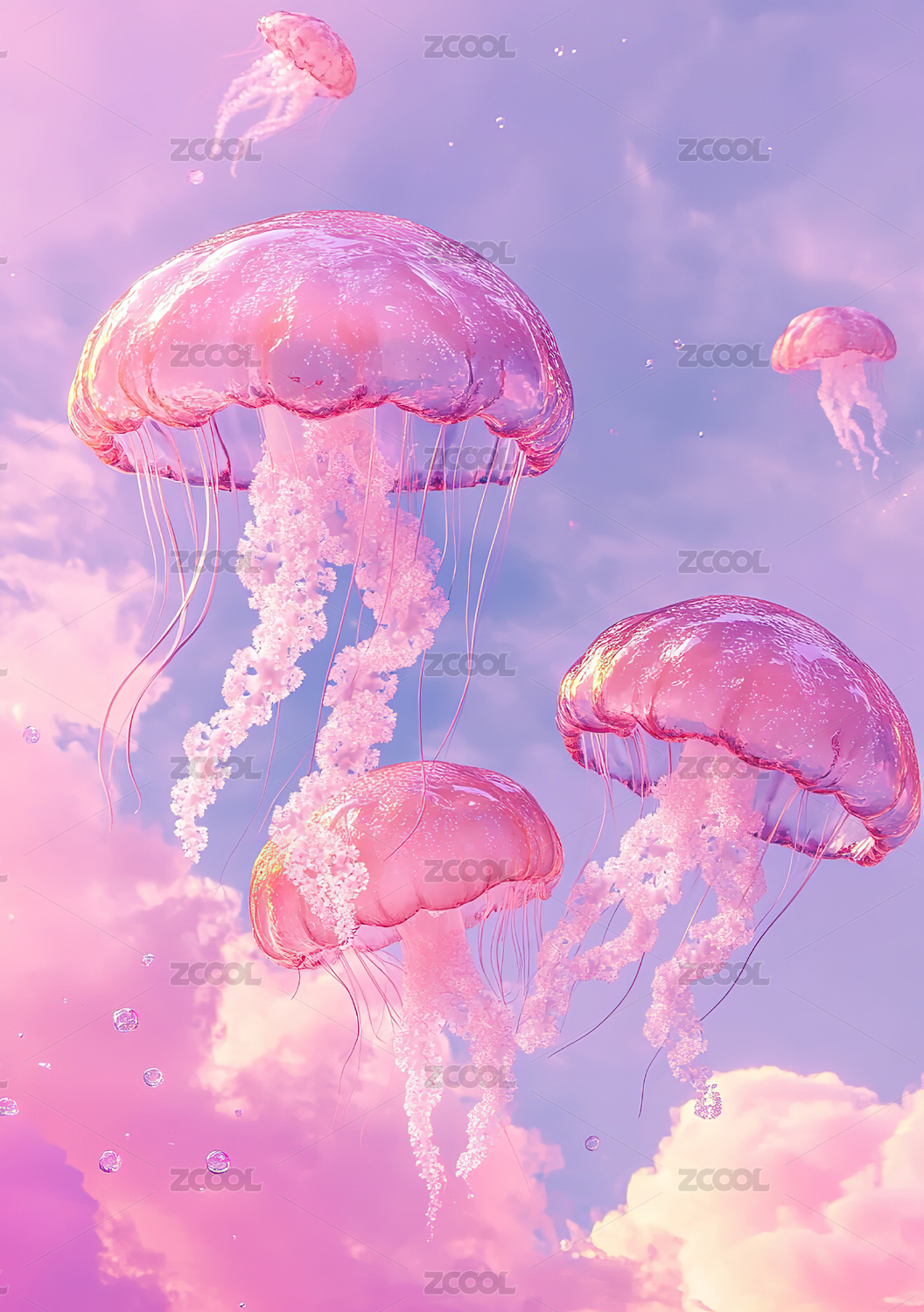 水母, 樱花, 天空, 云朵, 粉红色, 梦幻, 水彩, 仙境, 艺术, 插画