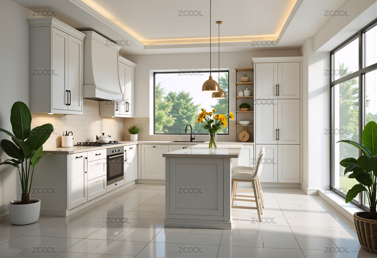 厨房,轻奢,奶油色,橱柜,岛台,灯光,家居,装修,家装,极简