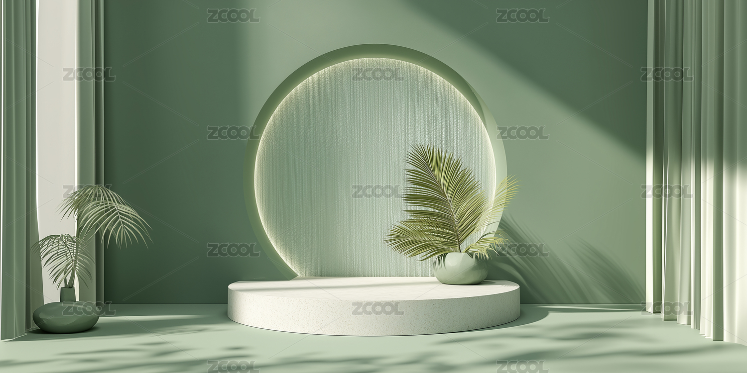 绿色植物与圆形展台的室内场景