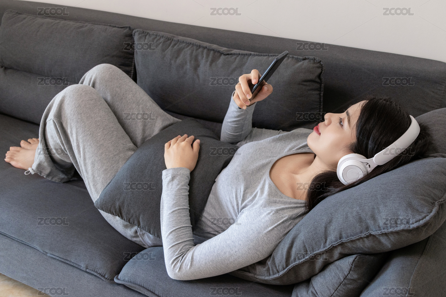 坐在落地窗前的真皮沙发上享受音乐吃香蕉的孕妇