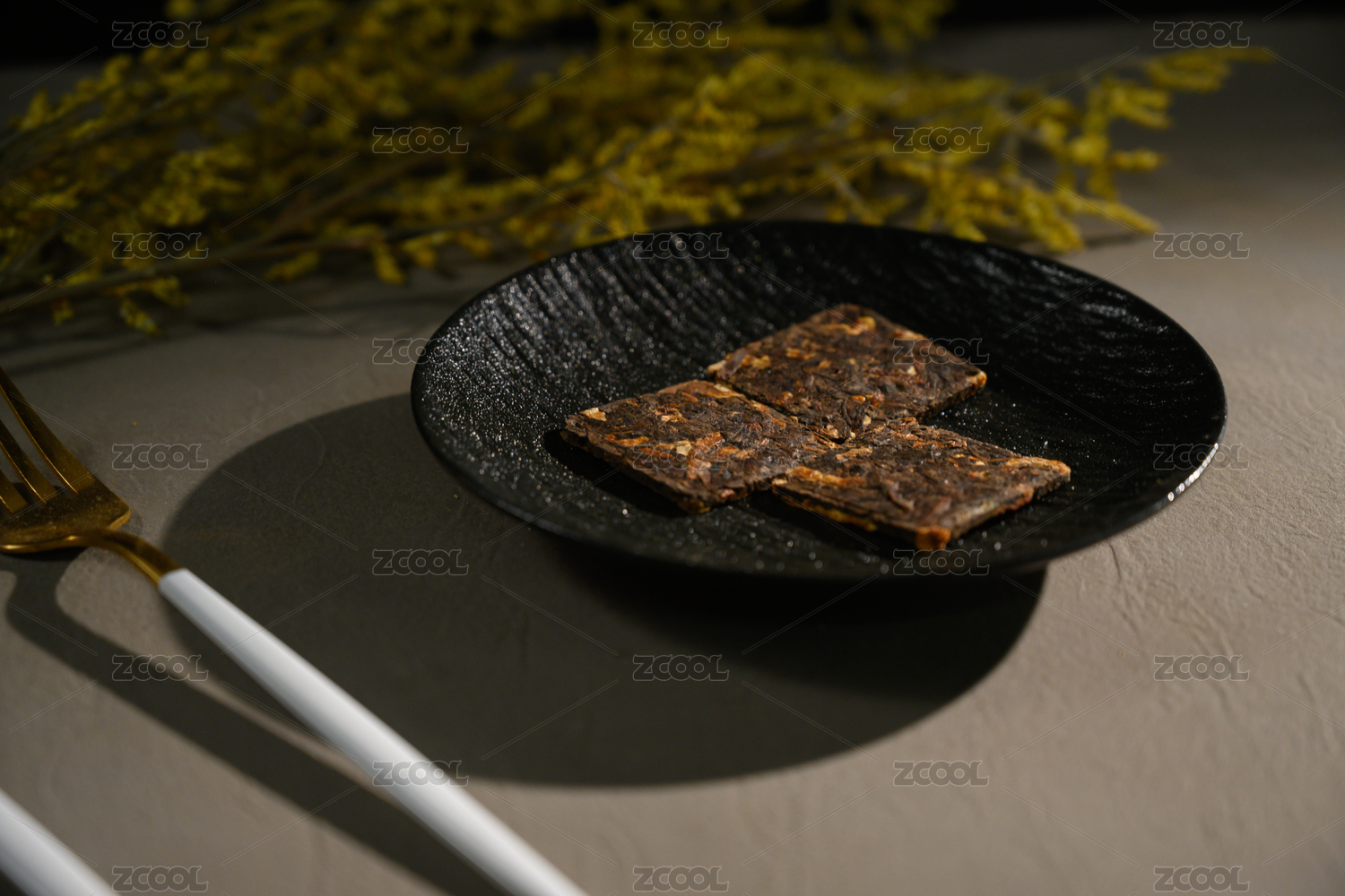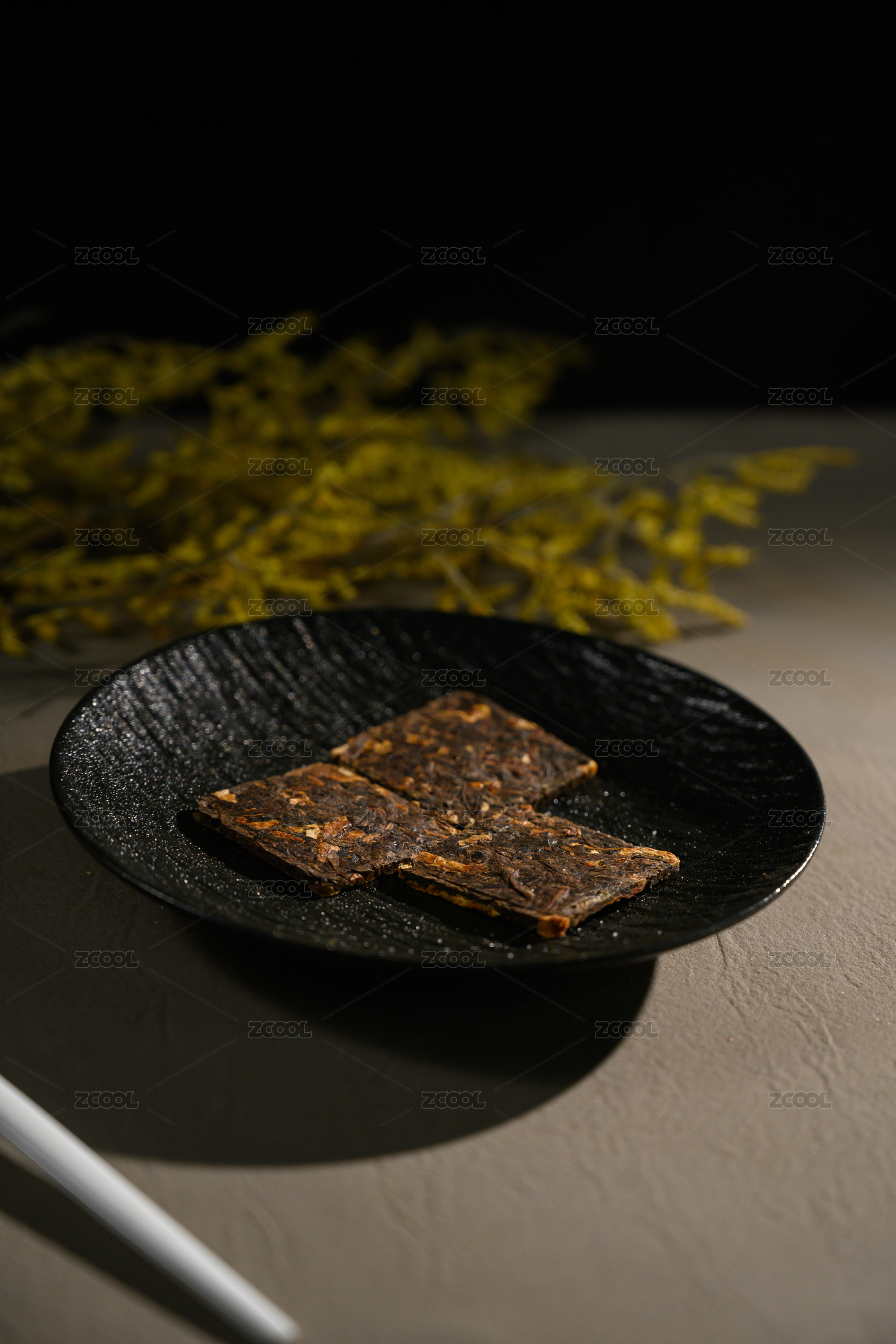 桌面上的盘子里的干爽香气四溢的陈皮普洱