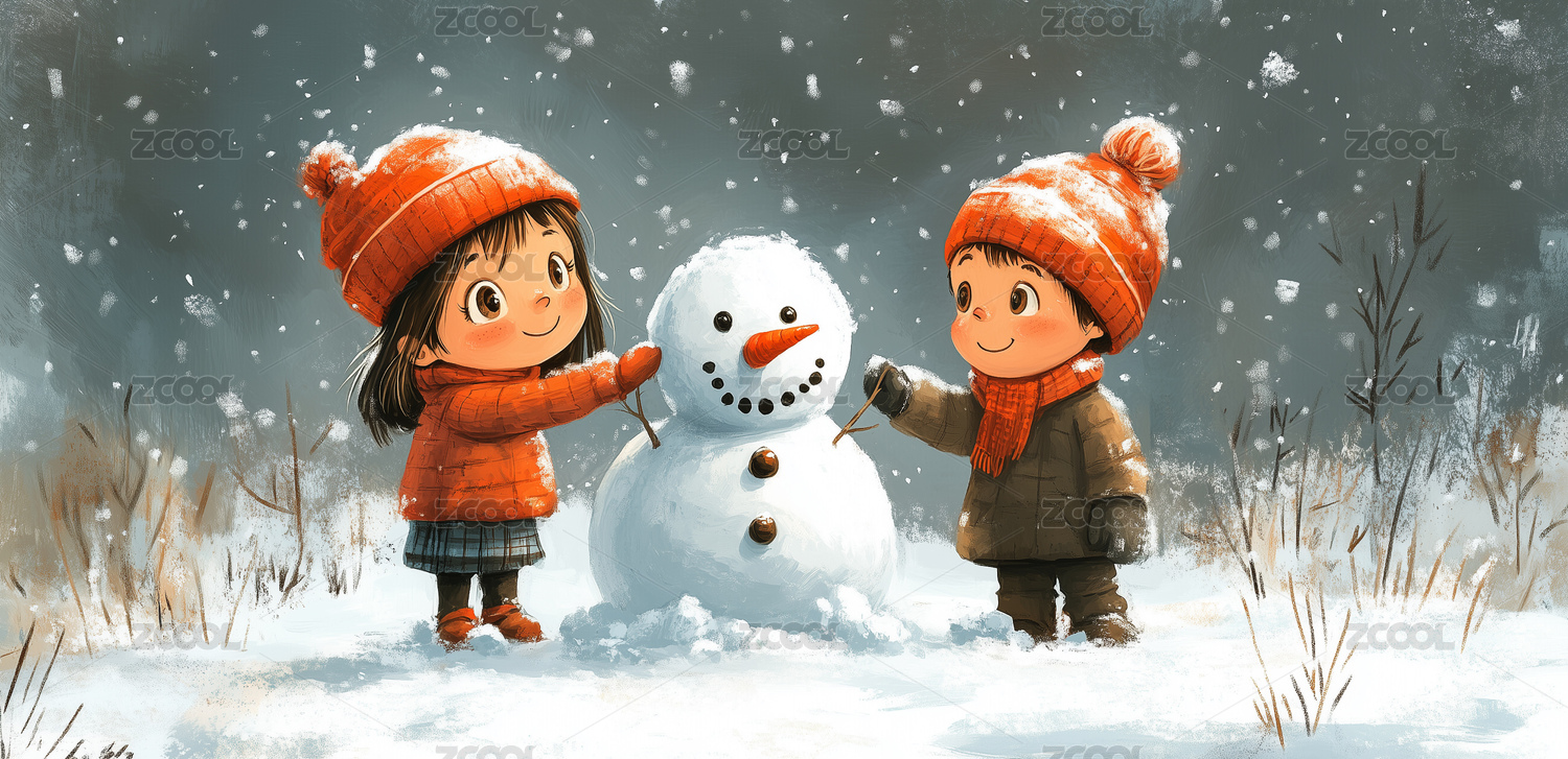冬天堆雪人的小孩