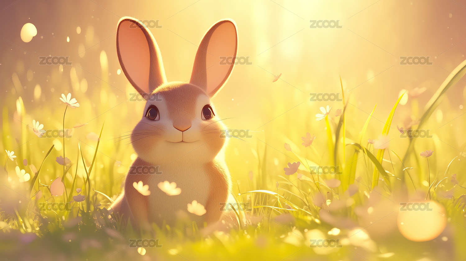 一只小兔子在黄昏的草丛中,3D卡通插画