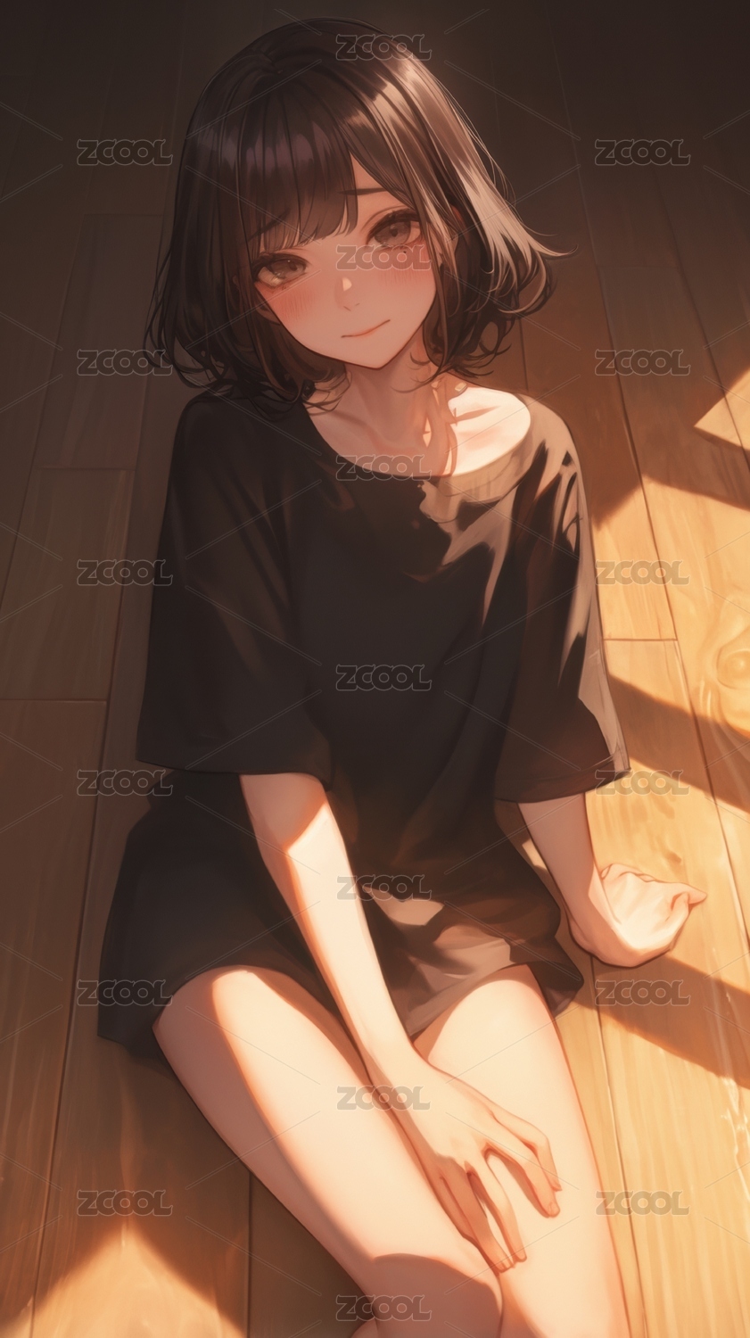室内地板上坐着的短发女孩