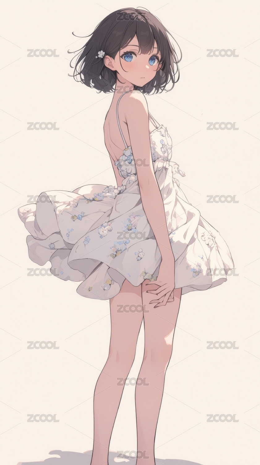 穿着蓝色吊带睡裙的可爱动漫少女