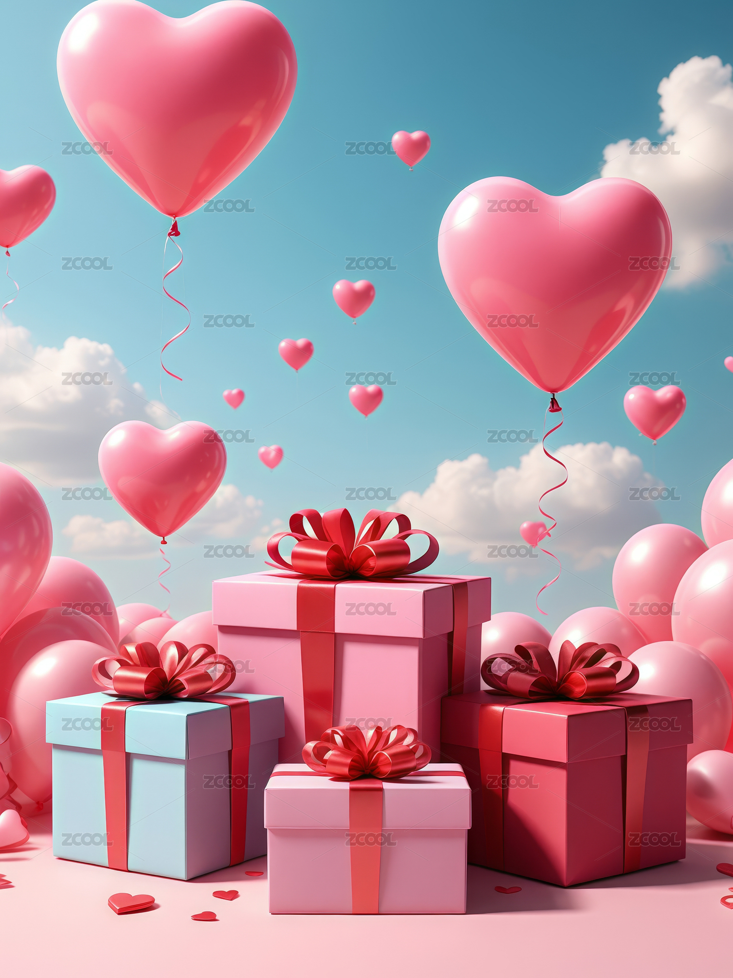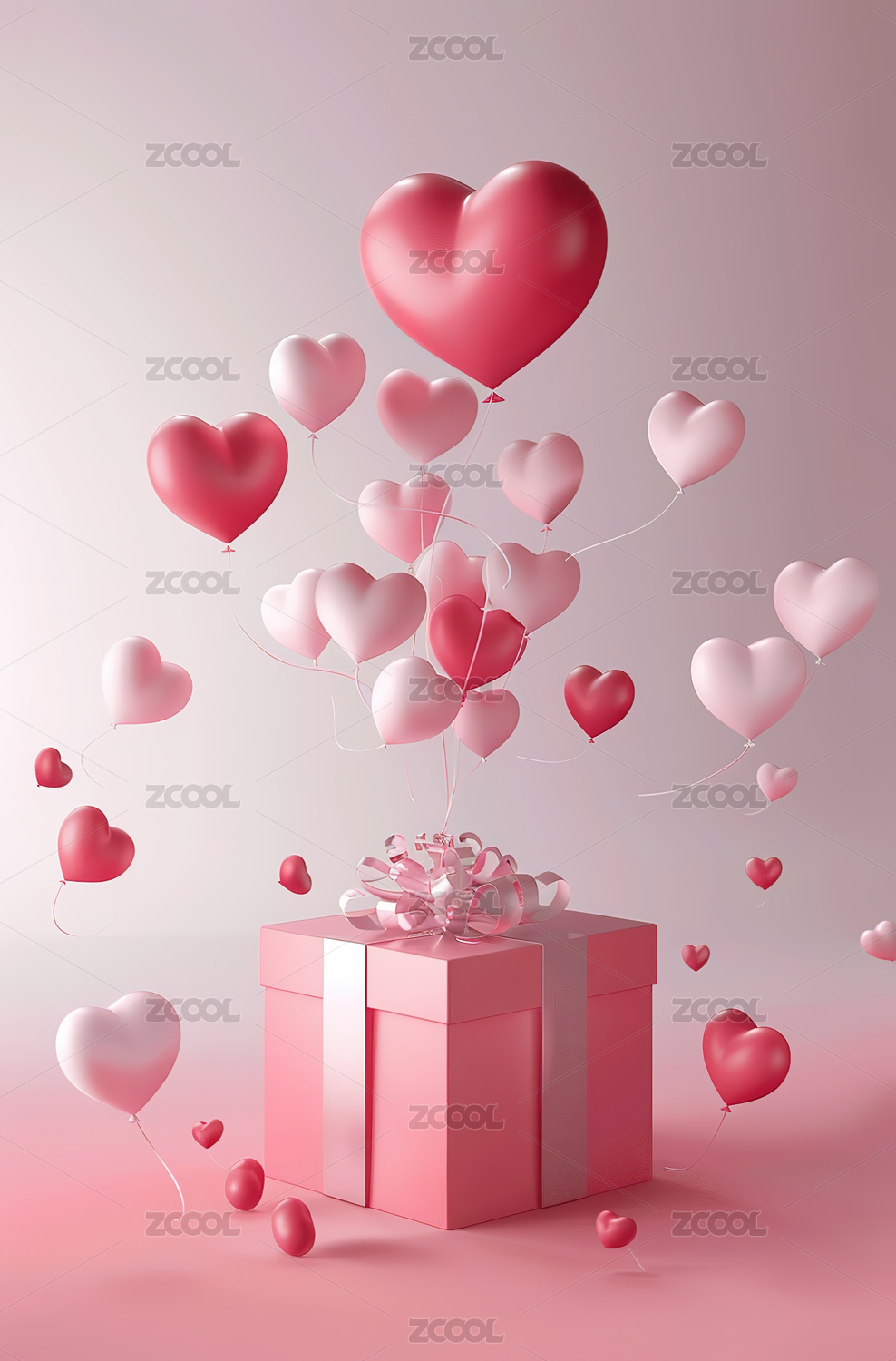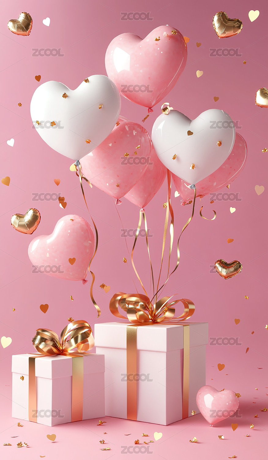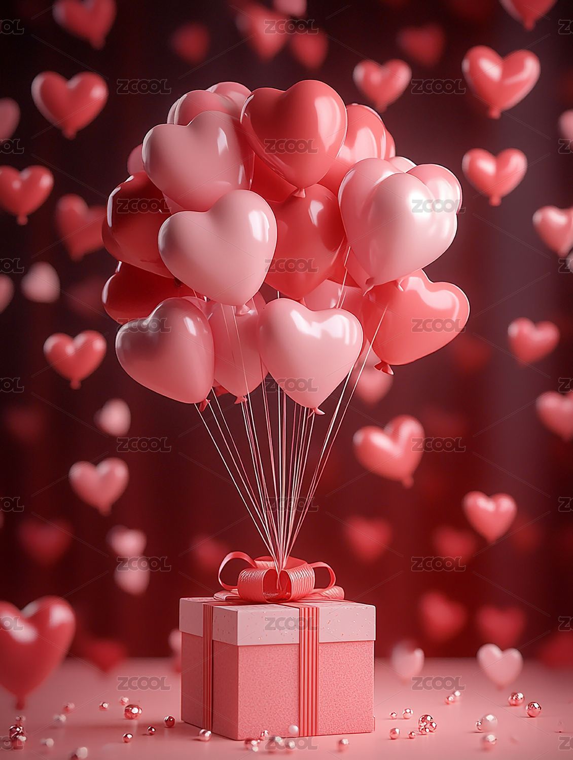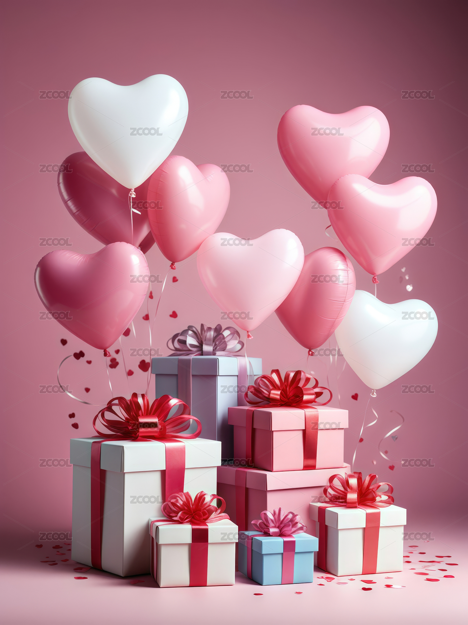 粉色爱心气球与礼盒浪漫情人节