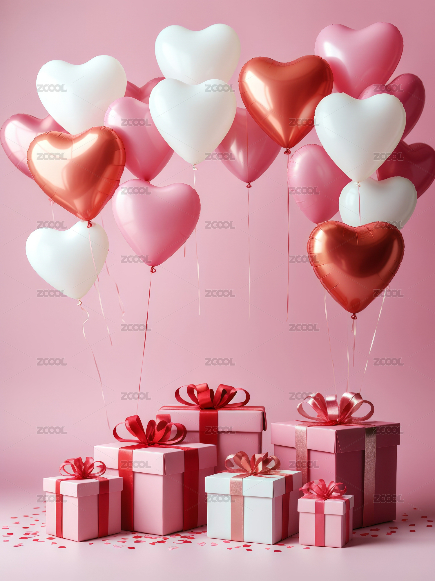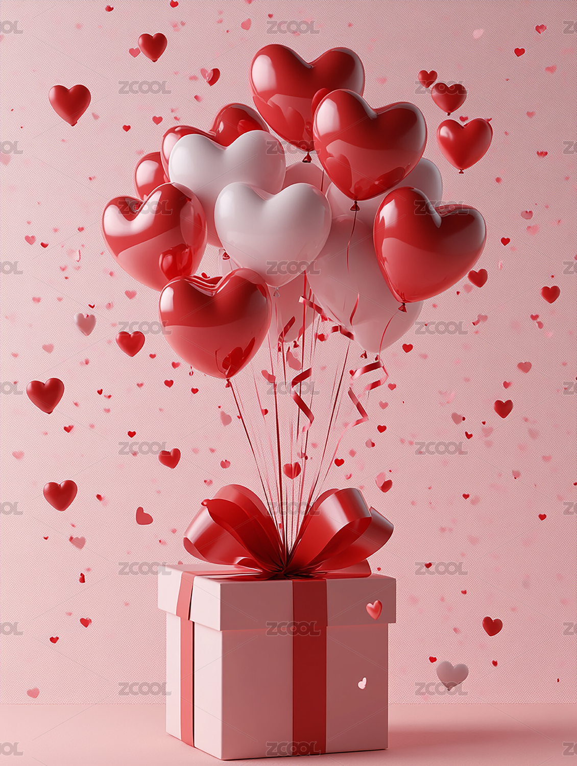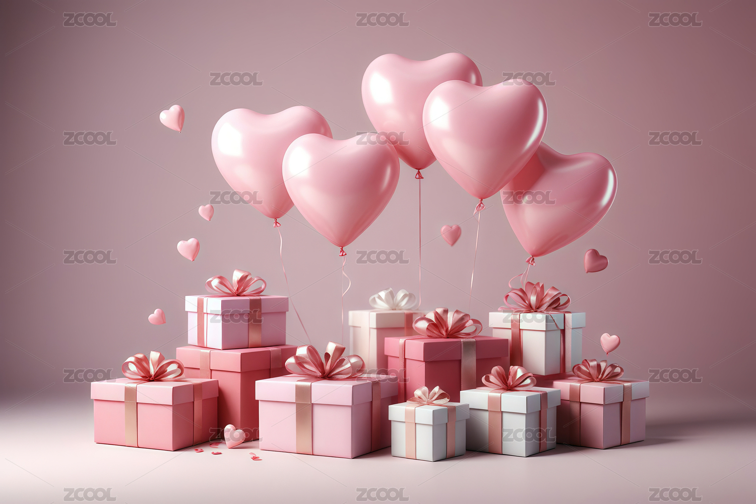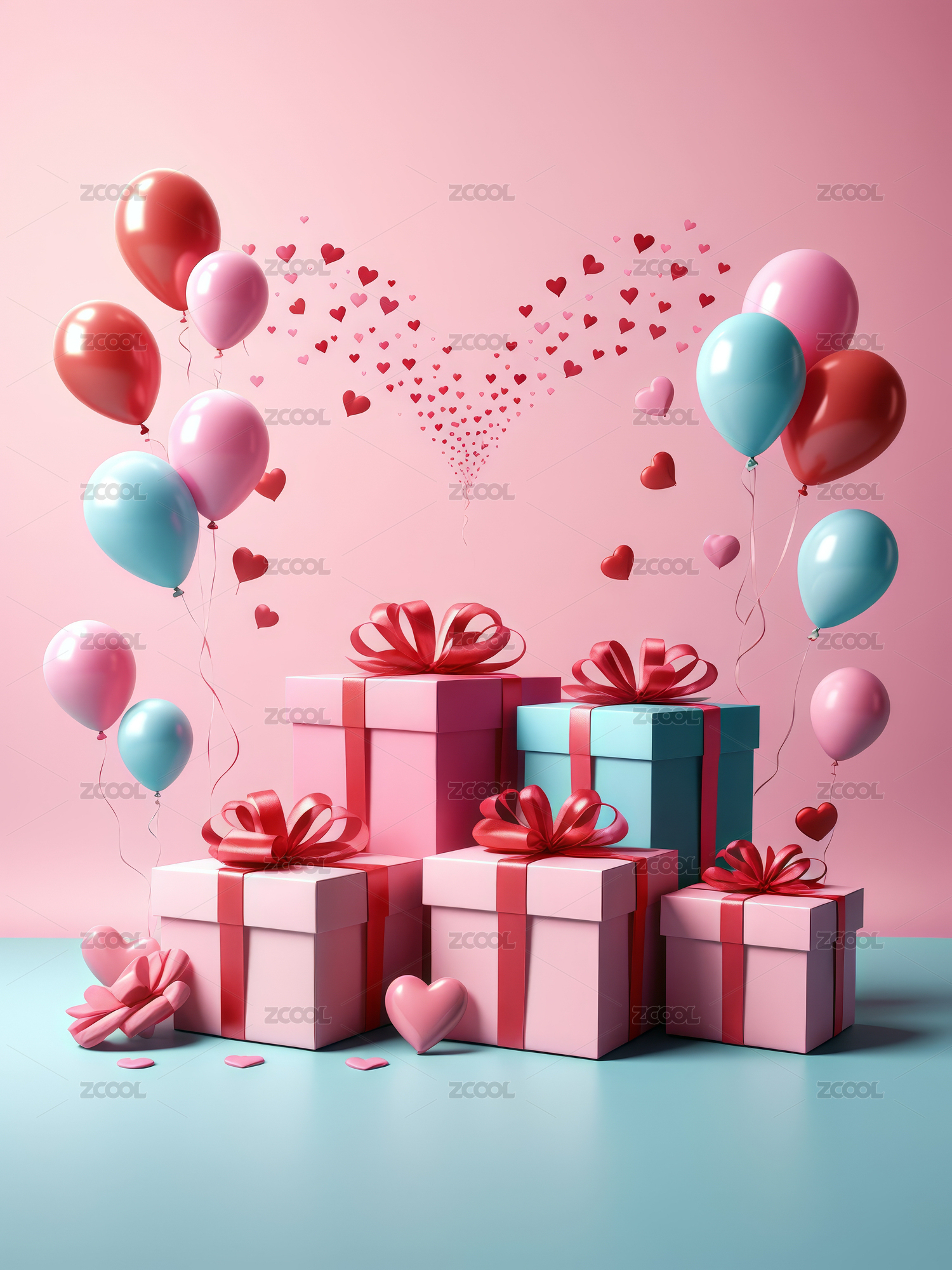 粉色爱心气球与礼盒浪漫情人节