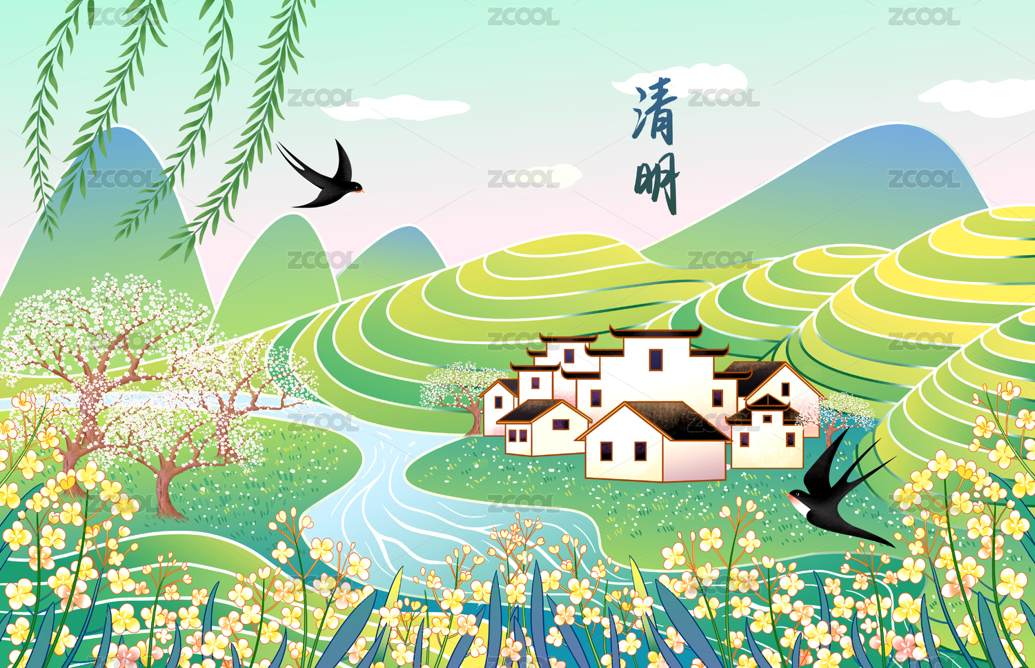 清明节婺源油菜花盛开风景插画海报