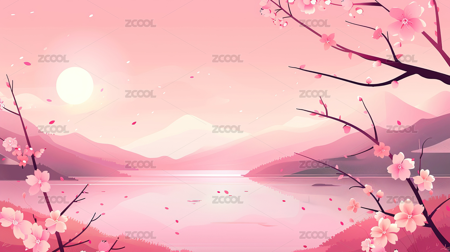 山峦,树木,景色,粉色,梦幻,宁静,花瓣,阳光,淡雅,湖泊