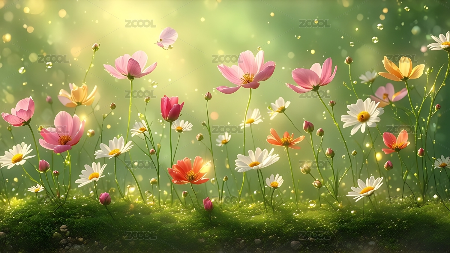 阳光下的粉色和白色花朵盛开在绿草丛中