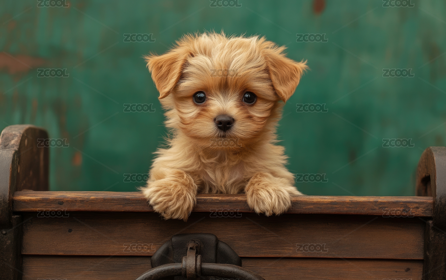 宠物,金毛,小狗, 狗崽子, 木箱, 木头, 背景, 绿色, 毛茸茸, 可爱