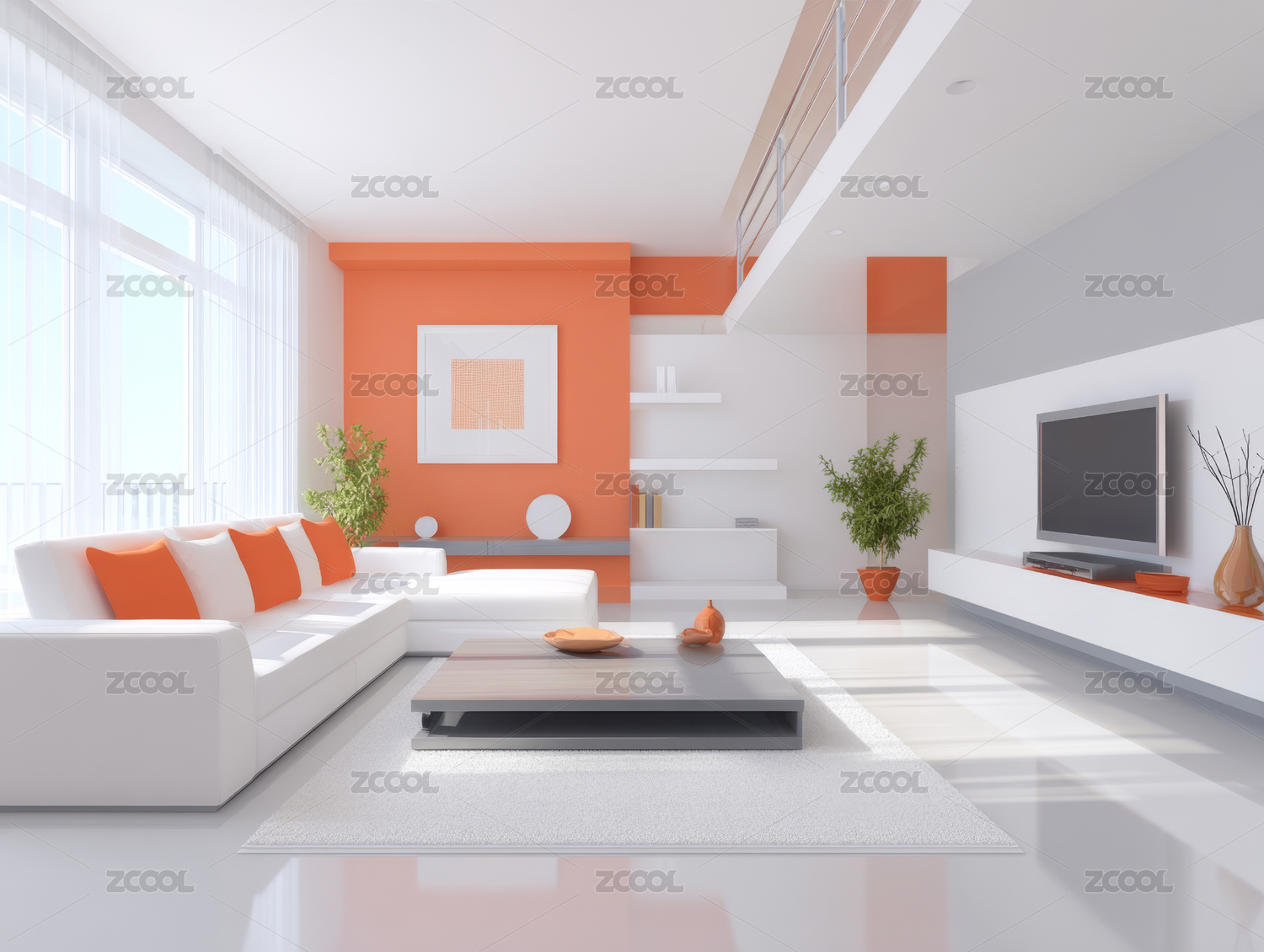 客厅,橙色,现代,沙发,茶几,地毯,窗户,植物,吊灯