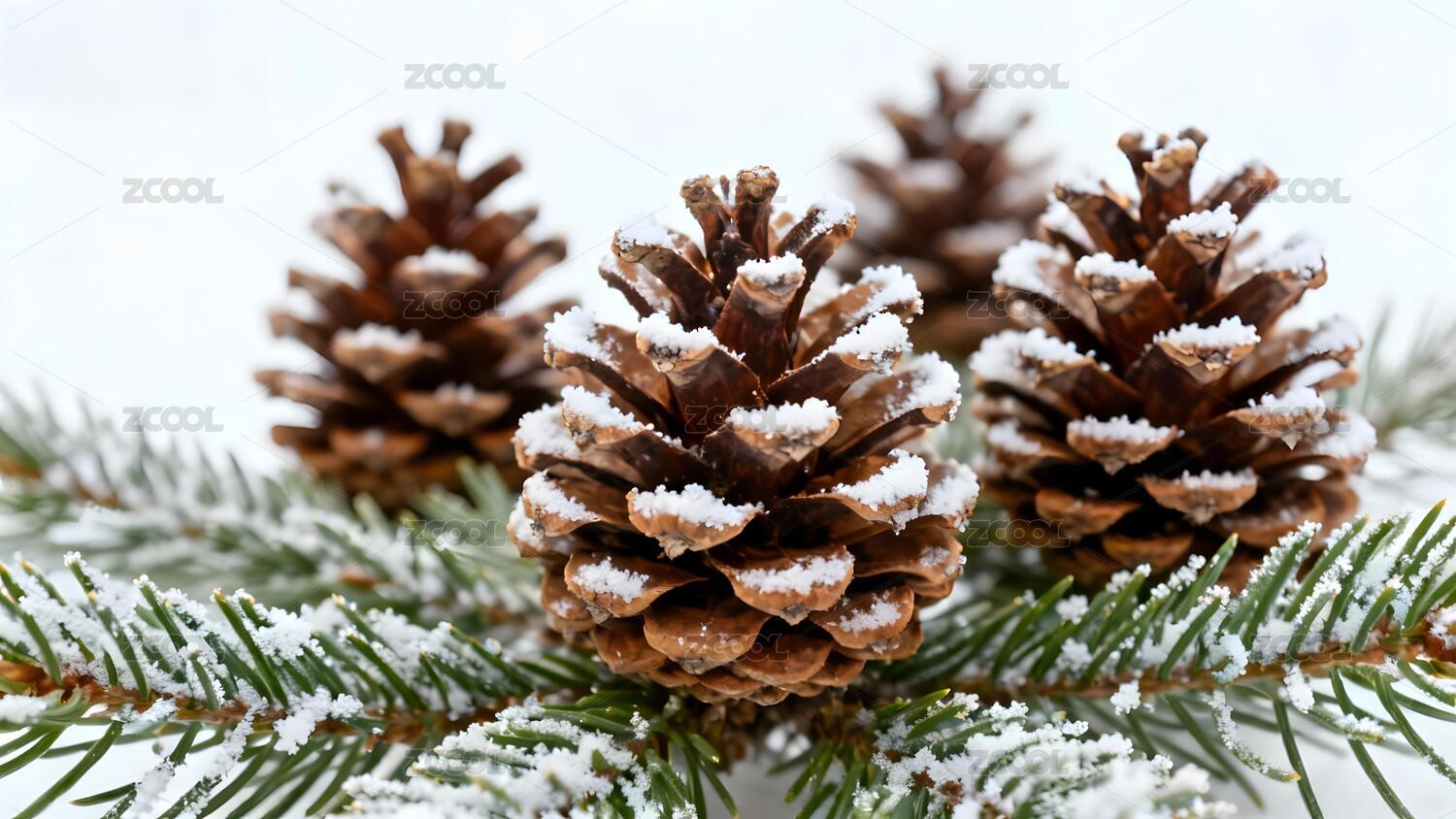 雪覆松枝与松果