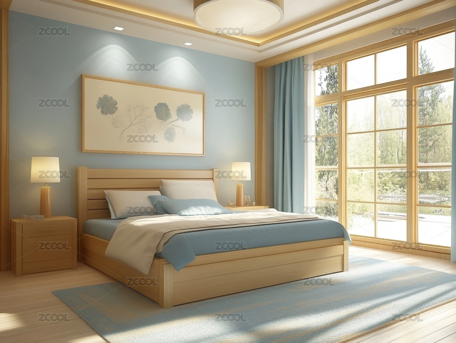 卧室,中式,绿色,床,吊灯,画作,窗户,窗帘,木质,家具