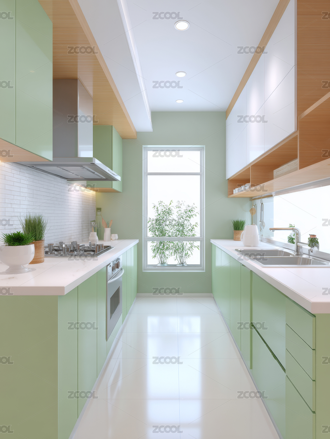 厨房,现代,红色,绿色,黄色,橱柜,灯光,装饰,电器,整洁