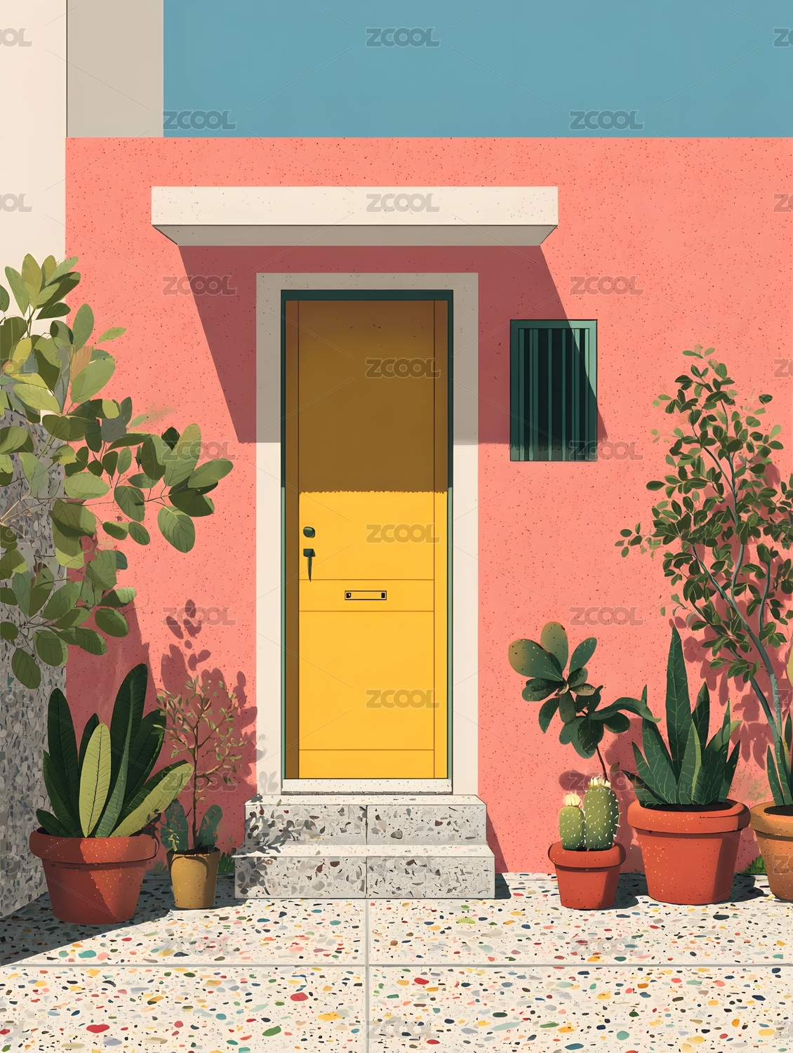 阳光下的粉色墙面黄色门与绿植,静谧舒适