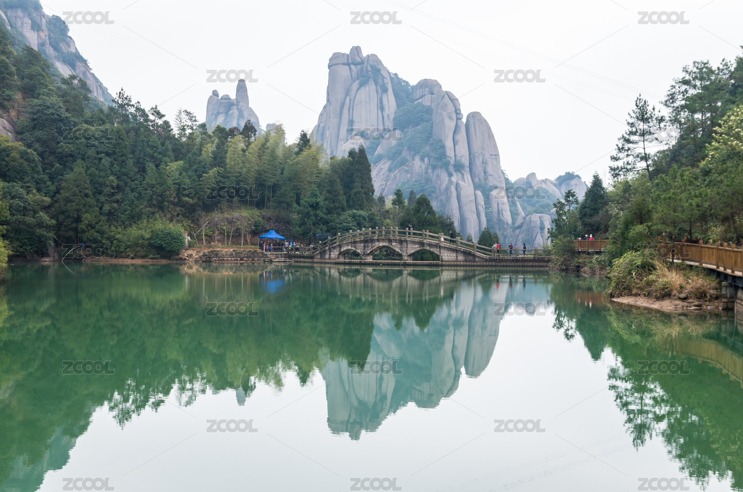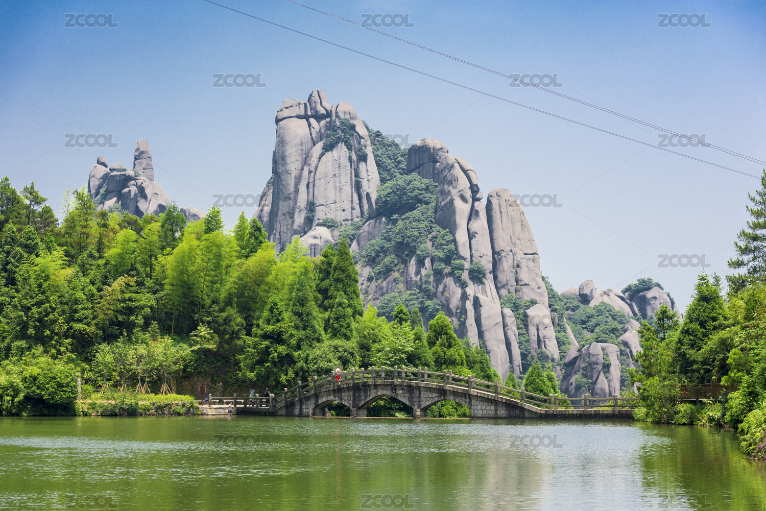 太姥山的花岗石山峰及山脚的湖面和石拱桥