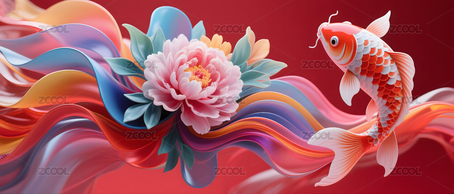 金边锦鲤牡丹中国传统国潮花卉刺绣插画