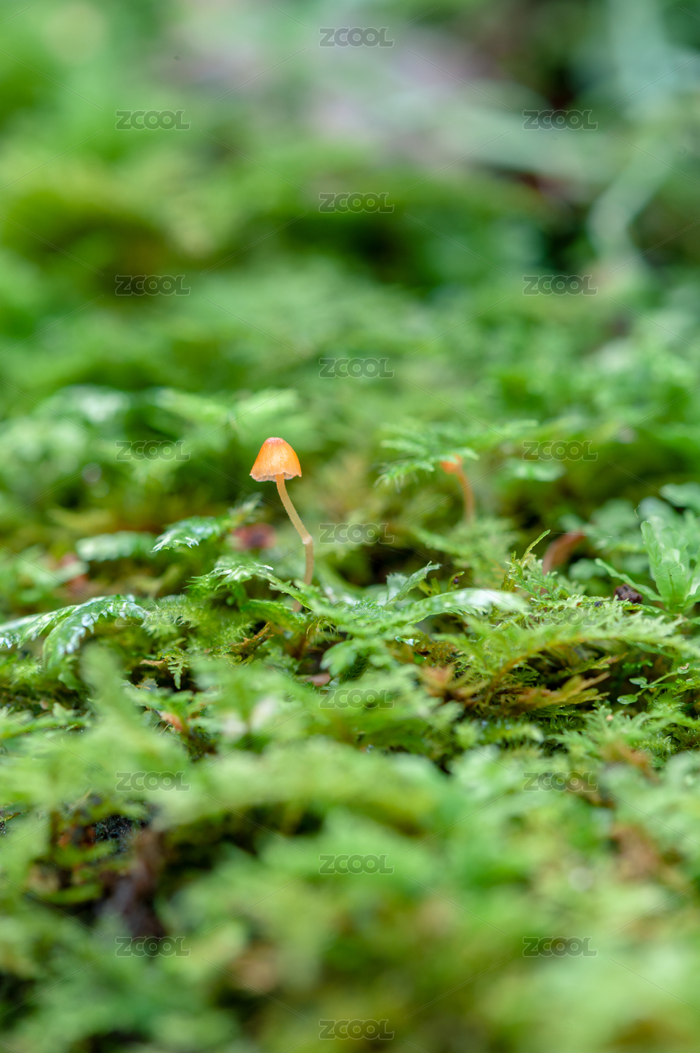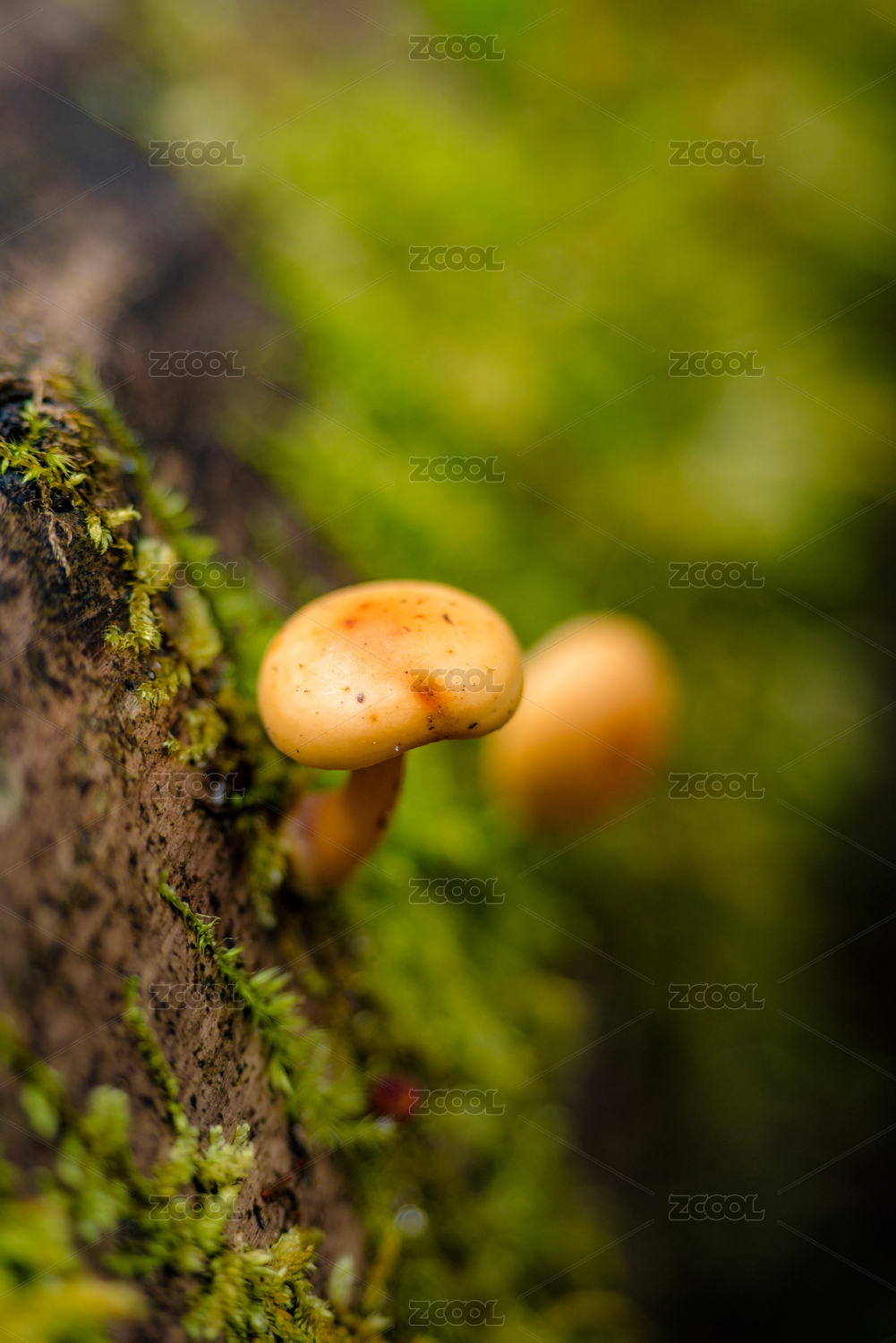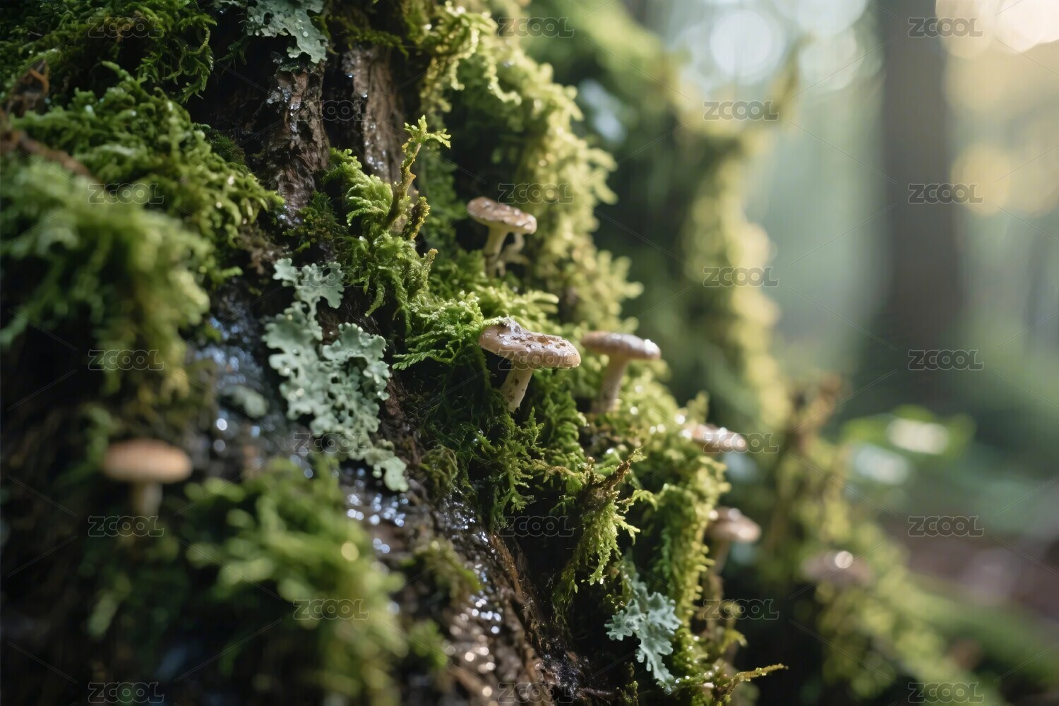 雨后长满苔藓的枯树上长出许多伞状的小菌菇