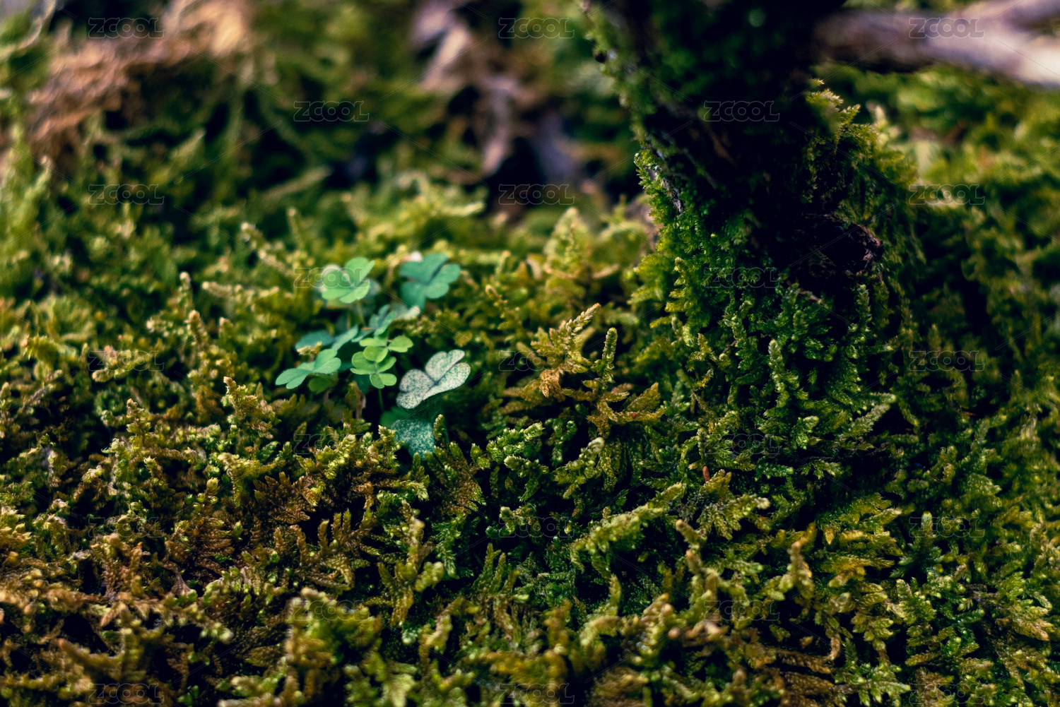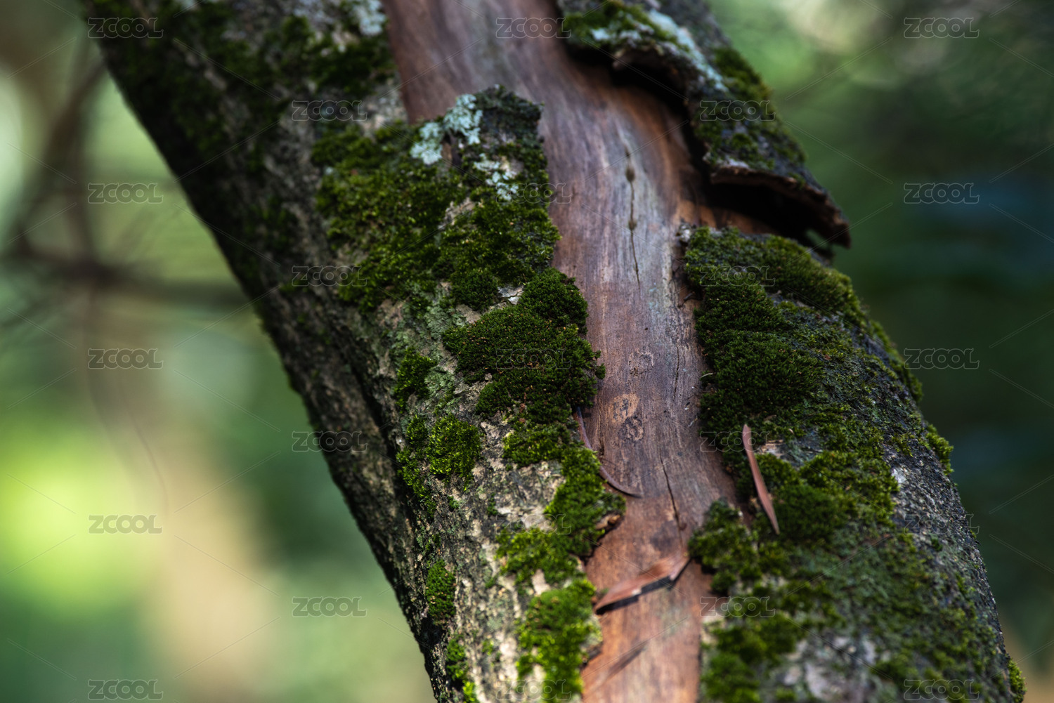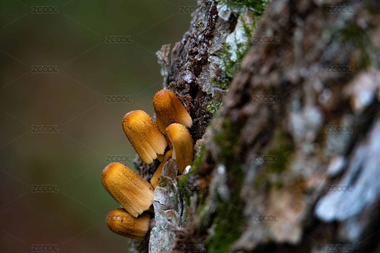 雨后长满苔藓的枯树上长出许多伞状的小菌菇