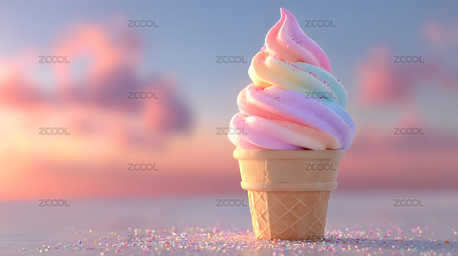 彩色冰淇淋在粉色云层上的甜美梦幻场景