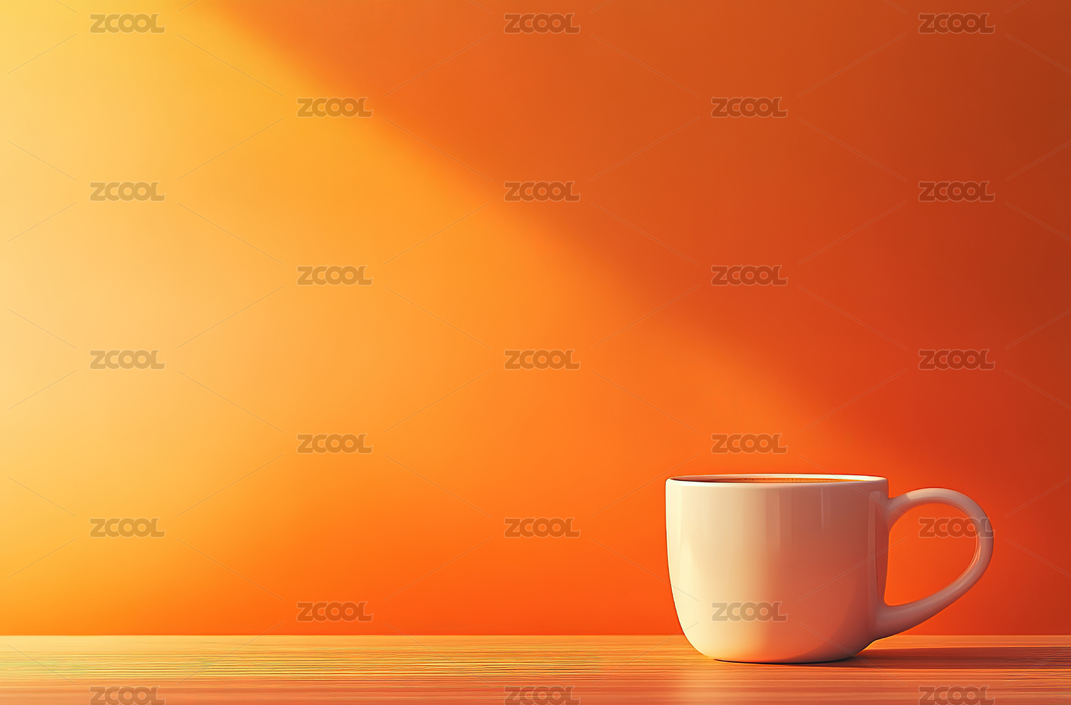 橙色背景下桌子上咖啡杯的特写镜头
