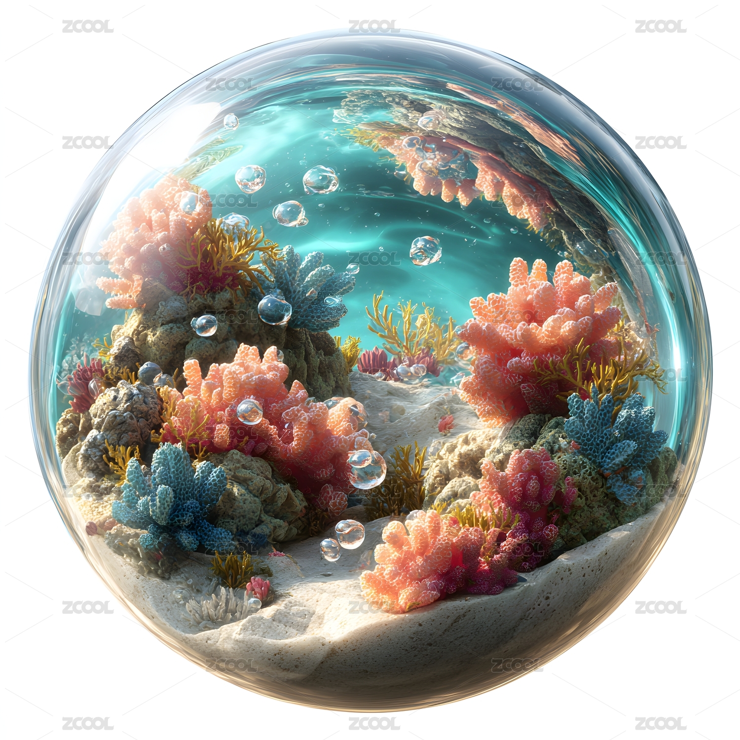 透明球体中的水下珊瑚生态