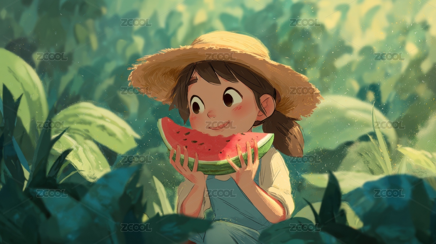 夏至手绘插画,戴草帽的女孩植物与西瓜
