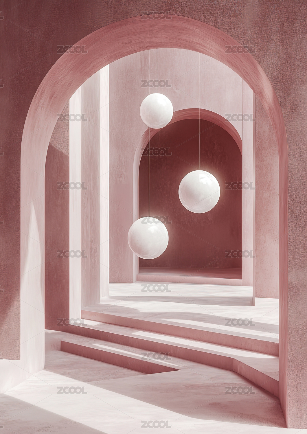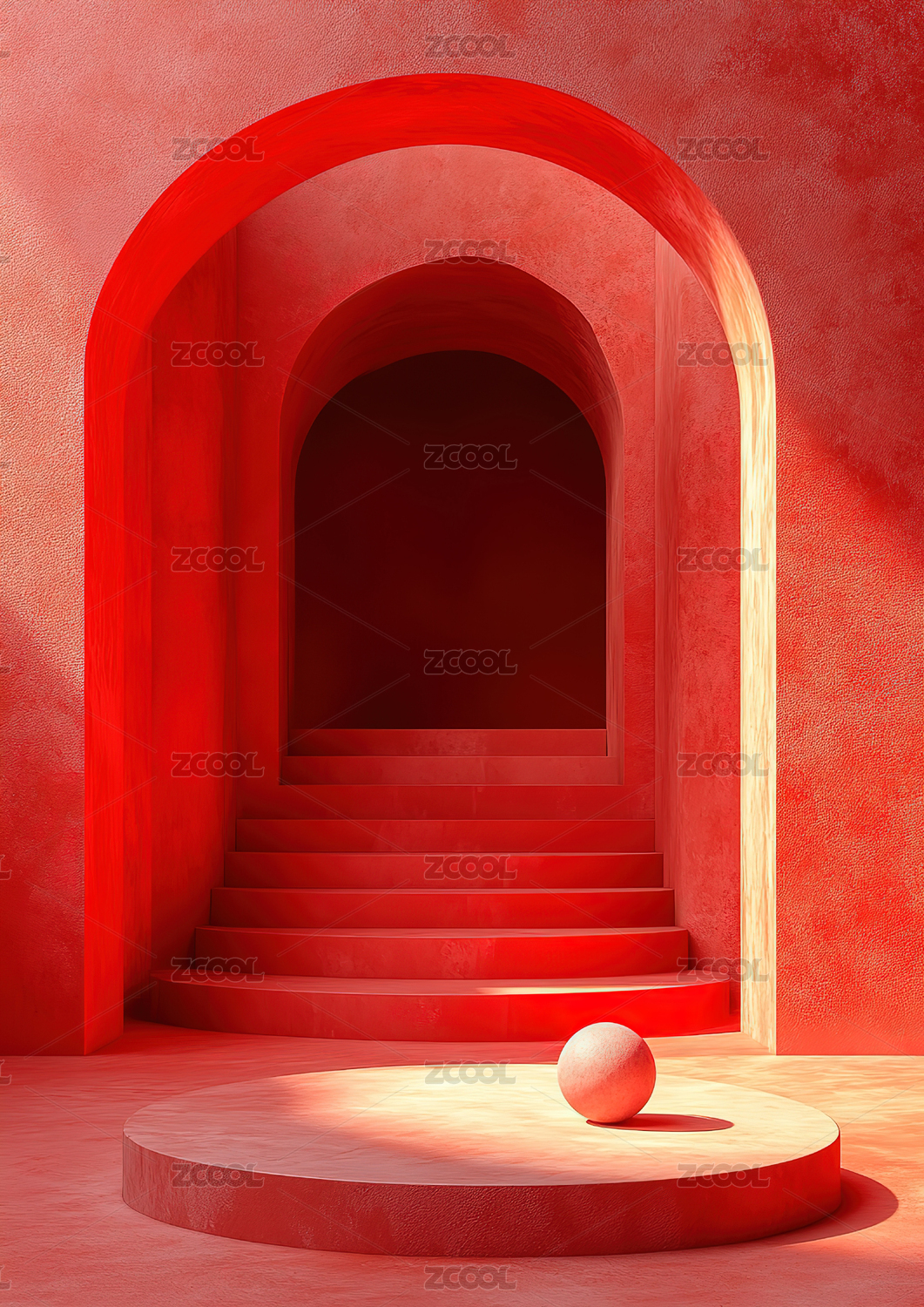 抽象极简主义拱门楼梯和球体
