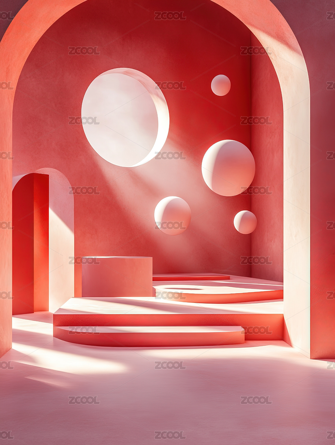 3D红色极简拱门透视空间电商产品展台