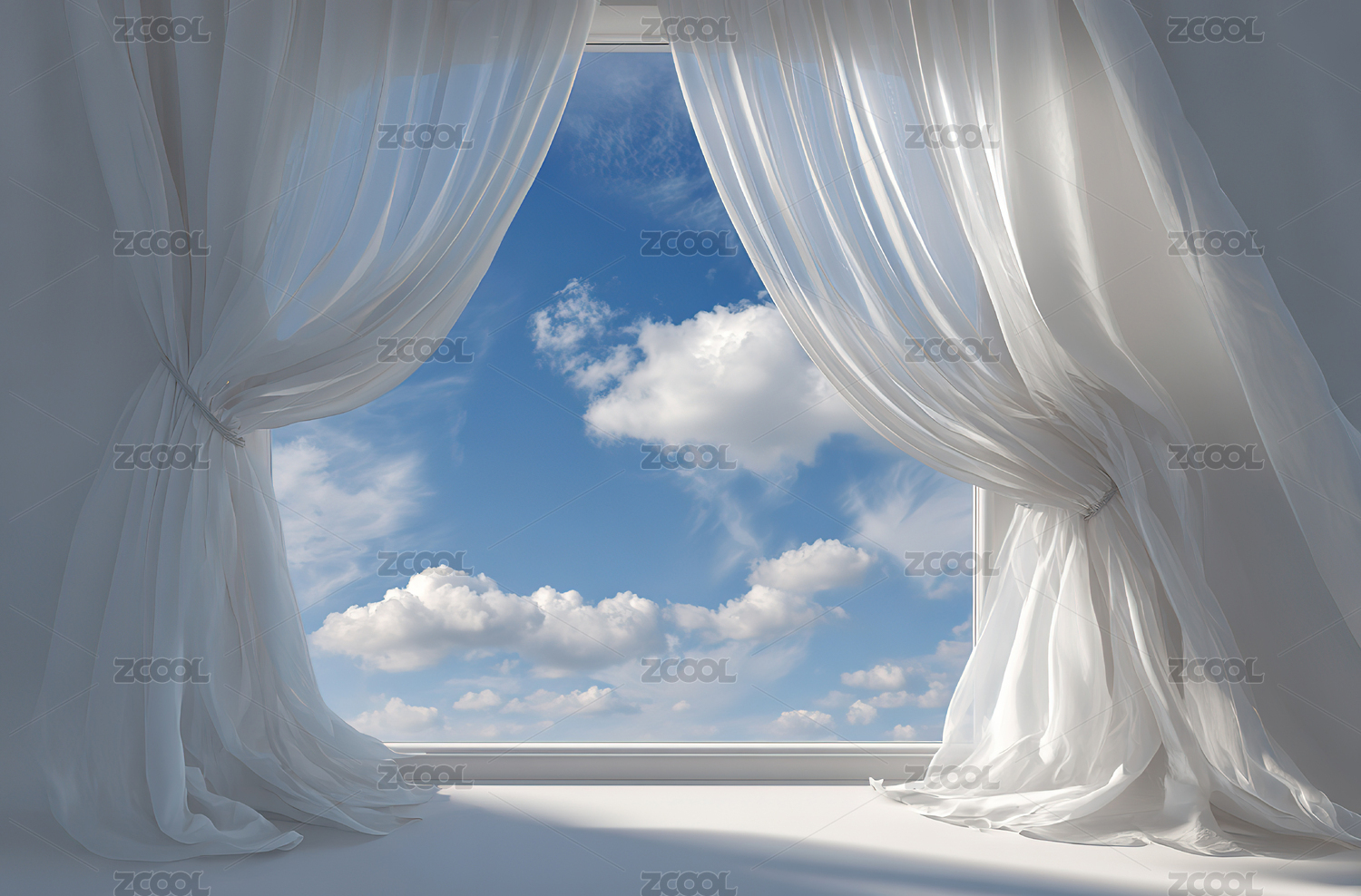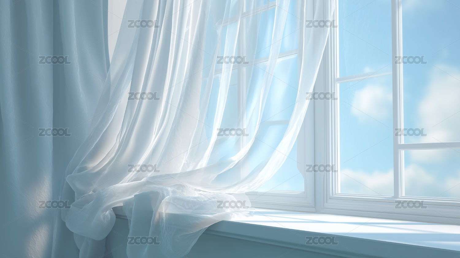 白色窗帘后的蓝天白云