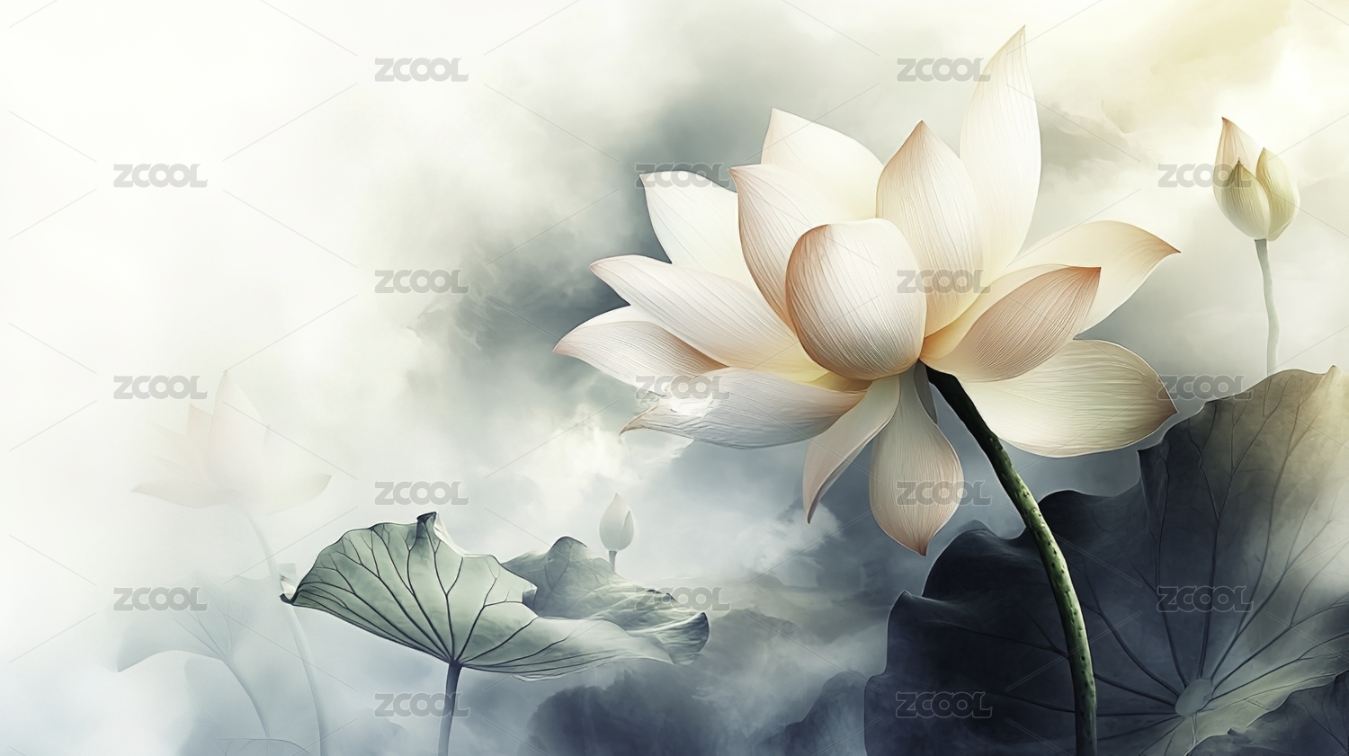 莲花,洁白,浅绿,背景,花瓣,花蕊,莲叶,花苞,盛开,清新