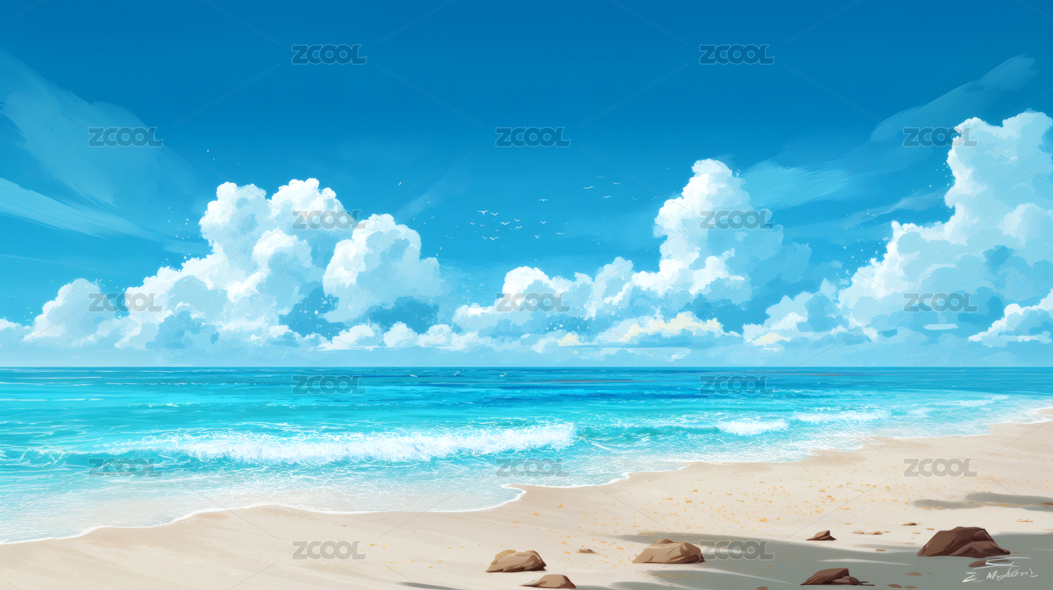 海滨,海浪,沙滩,阳光,蓝天,云朵,海水,泡沫,波光,天际
